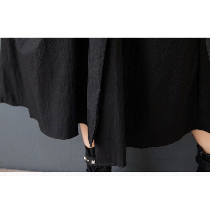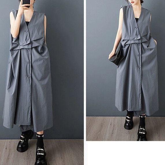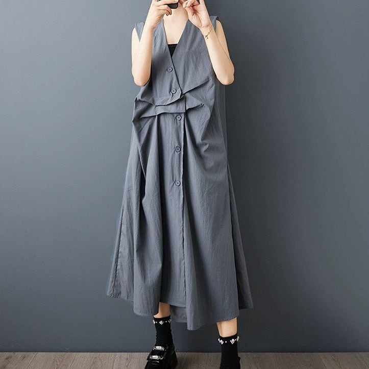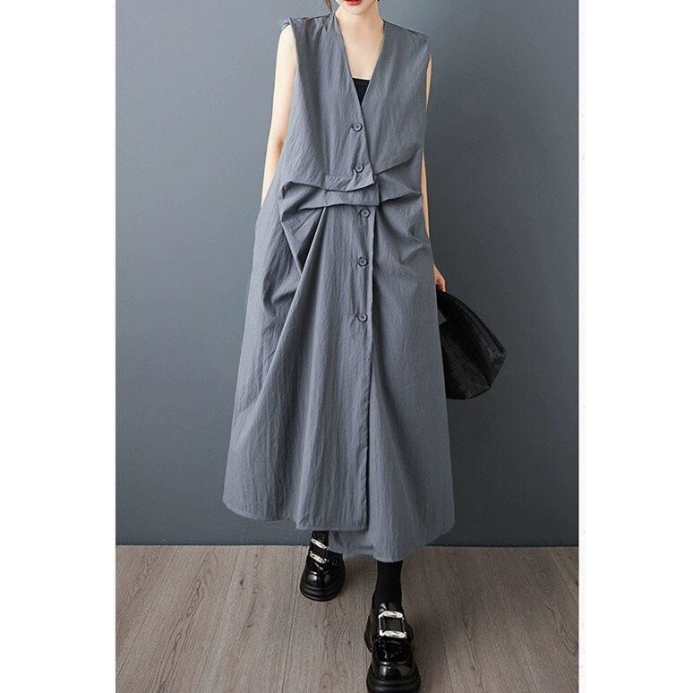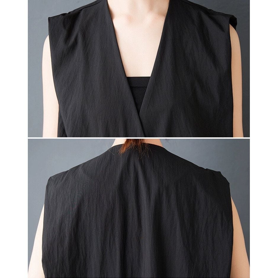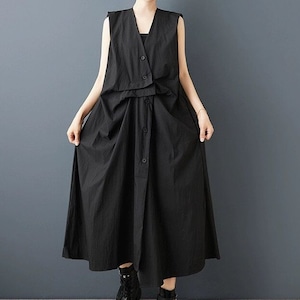 フロントのデザインプリーツが作り出すシルエットが魅力的な、Vネック・ノースリーブ・膝下丈のシャツワンピースです。単色のシンプルなデザインが、クールで都会的な印象のアイテムです。ブラックとグレーの2色から選べます。