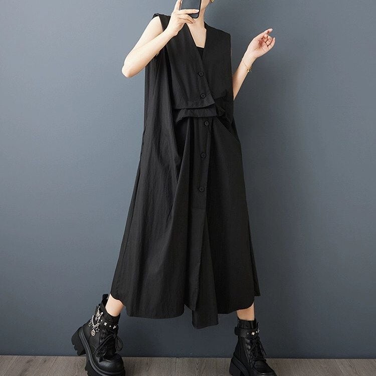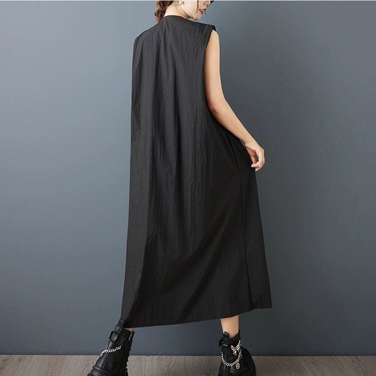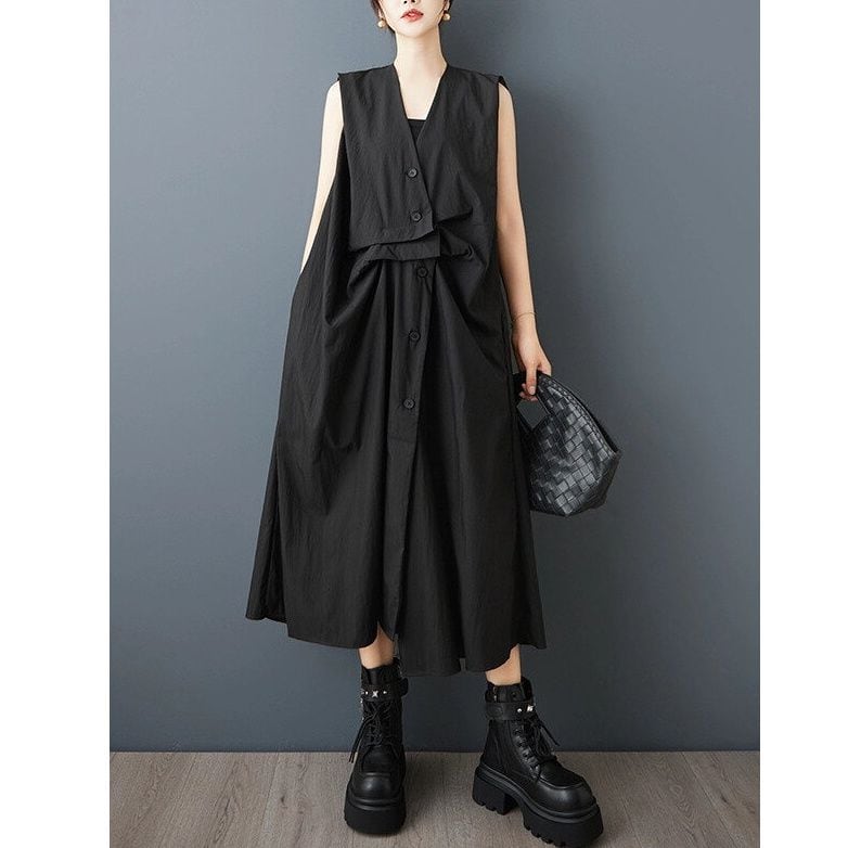 SOLID V-NECK SLEEVELESS A-LINE MIDI SHIRT DRESS 2colors M-14156