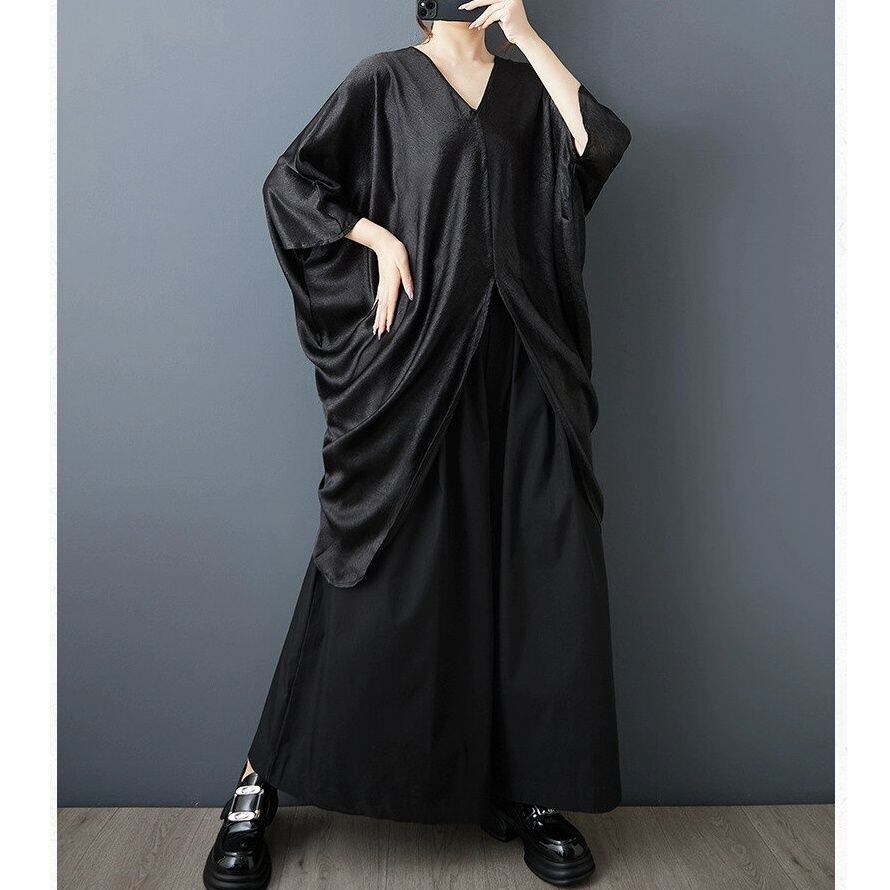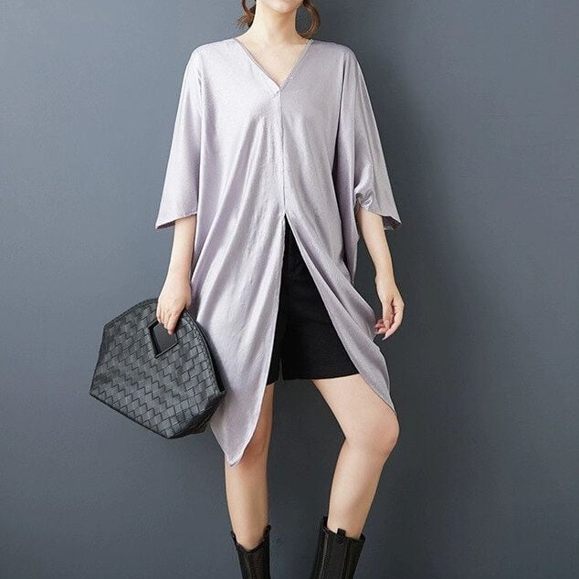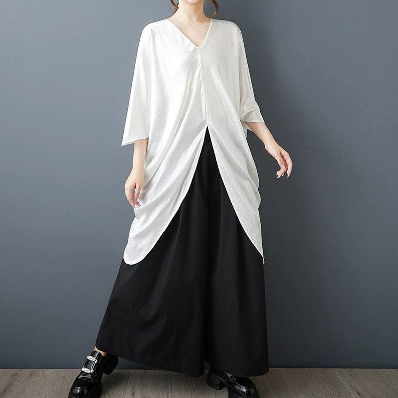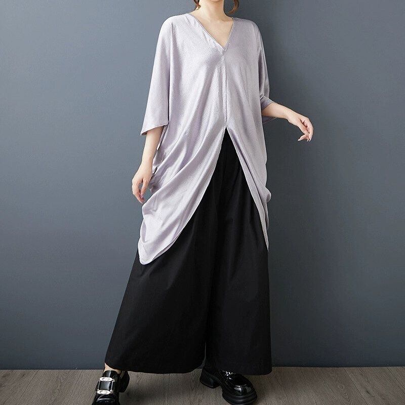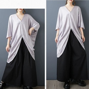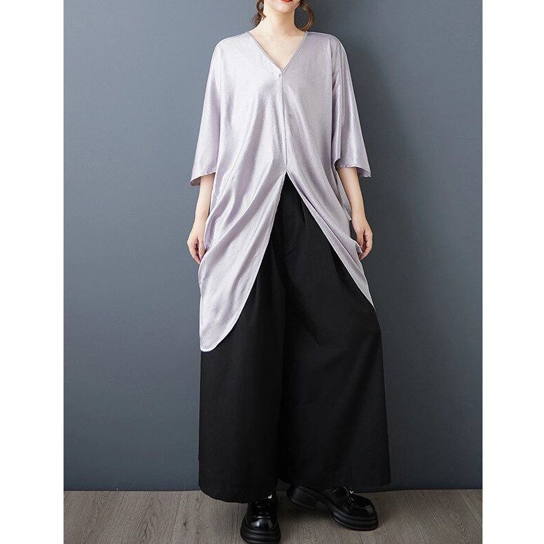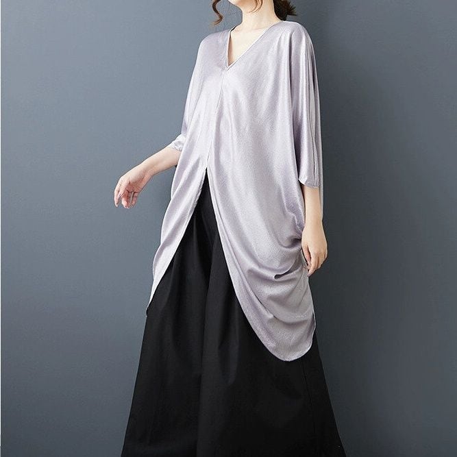 艶のある滑らかな単色素材でできた、Vネック・7分袖・イレギュラーヘムのプルオーバートップです。サイドが長い逆V字の裾が目を惹く、ゆったりとしたシルエットでエレガントな印象のアイテムです。シルバー・ブラック・ホワイトの3色から選べます。