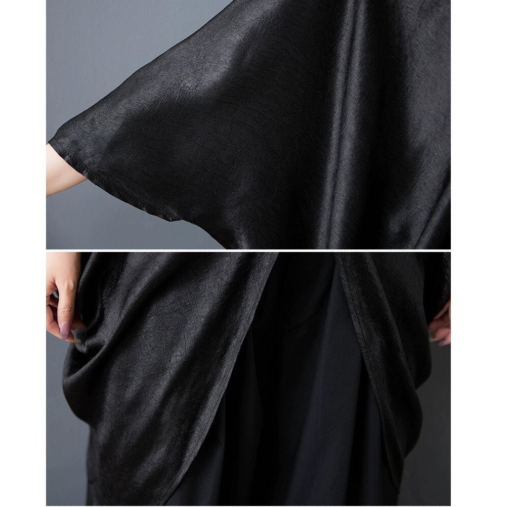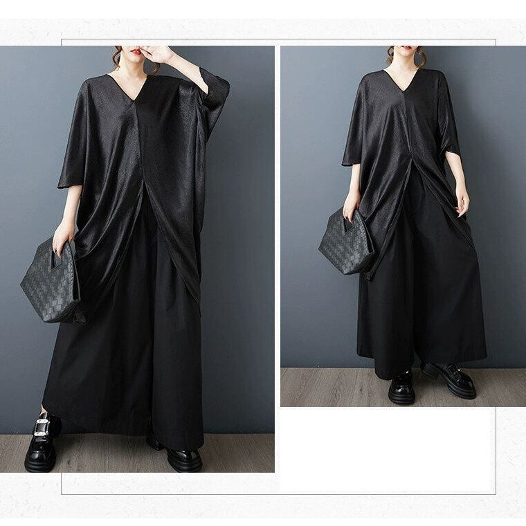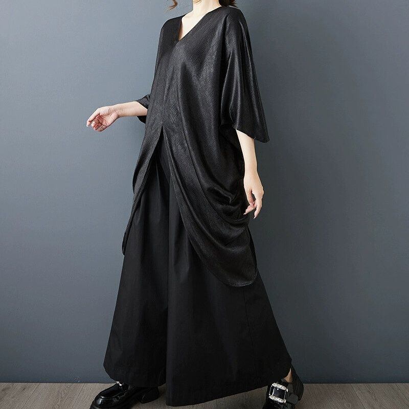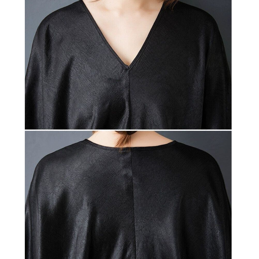 艶のある滑らかな単色素材でできた、Vネック・7分袖・イレギュラーヘムのプルオーバートップです。サイドが長い逆V字の裾が目を惹く、ゆったりとしたシルエットでエレガントな印象のアイテムです。シルバー・ブラック・ホワイトの3色から選べます。