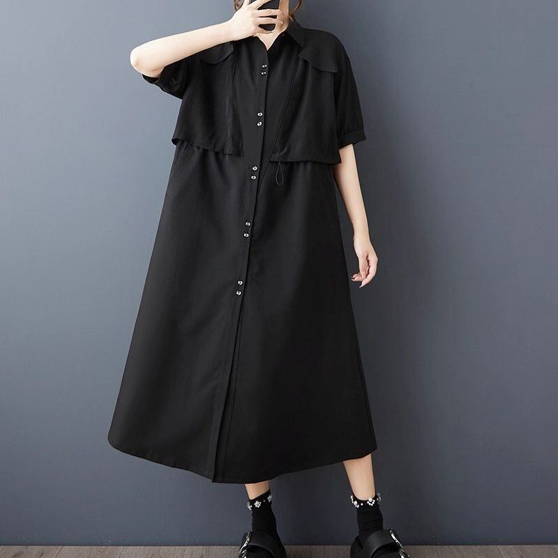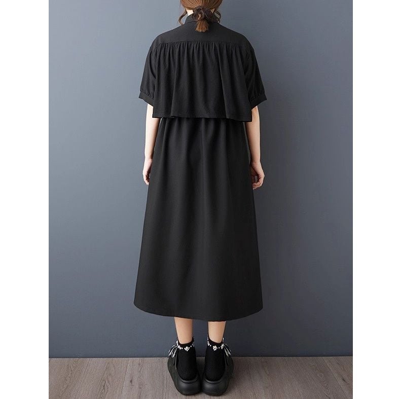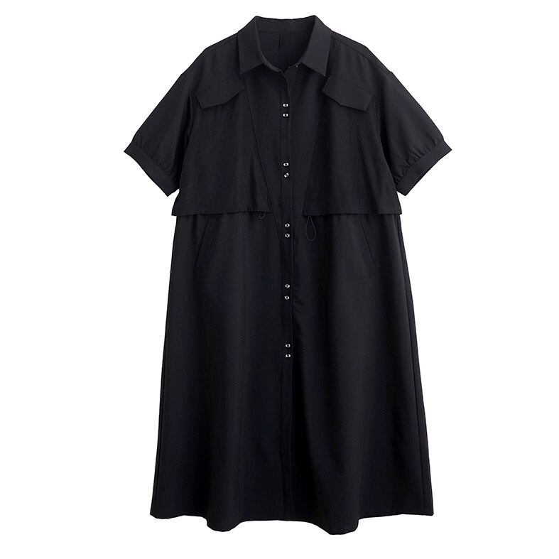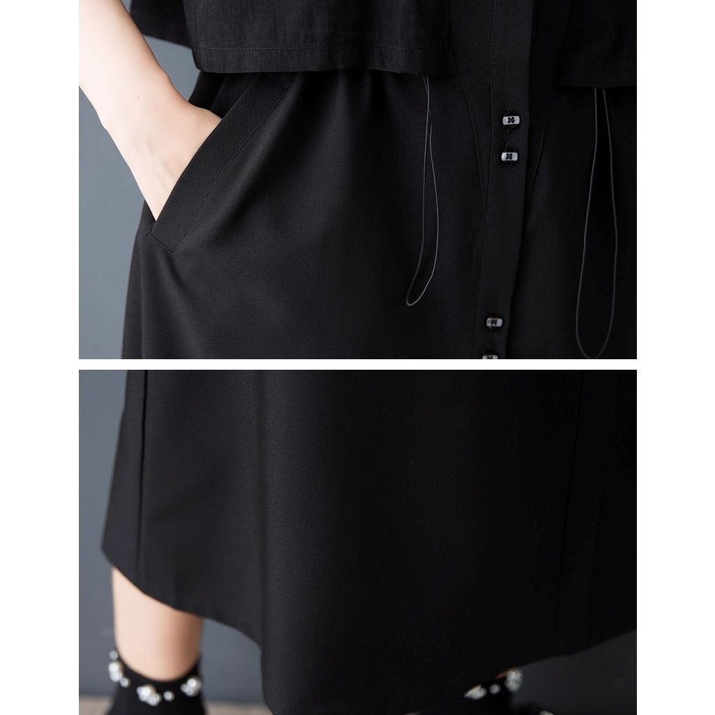 2つずつ並んだボタンがお洒落な、ブラックのポロ襟・半袖・膝下丈のシャツワンピースです。同じ生地のショートジャケットを羽織ったようなフェイクツーピースデザインがお洒落な、Aラインのアイテムです。ウエストはドローコードが付いて、シルエットを調節できます。