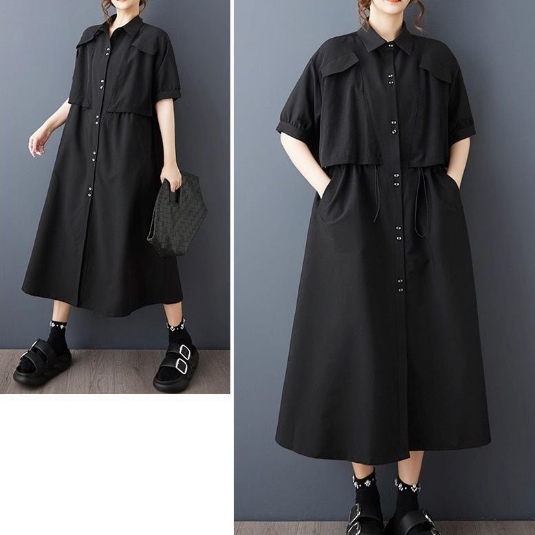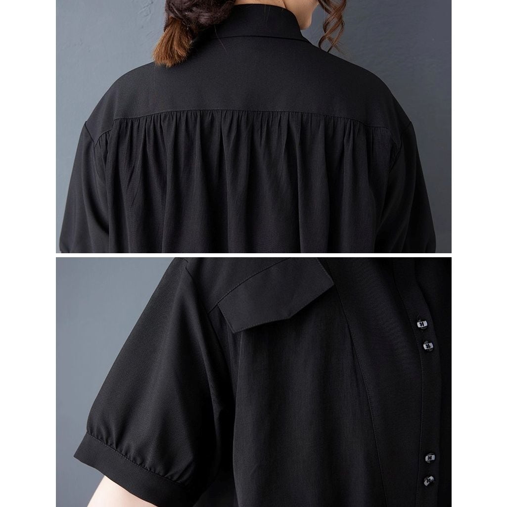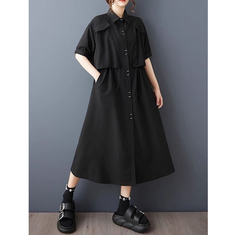 BLACK HALF SLEEVES A-LINE MIDI DESIGN SHIRT DRESS 1color M-14174
