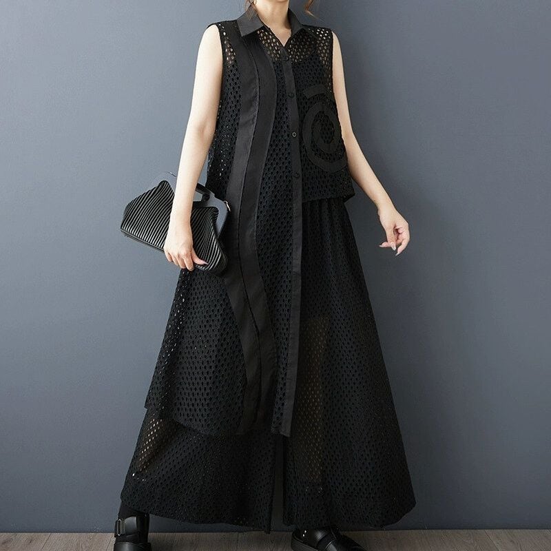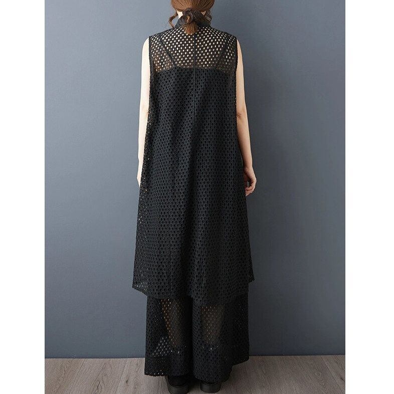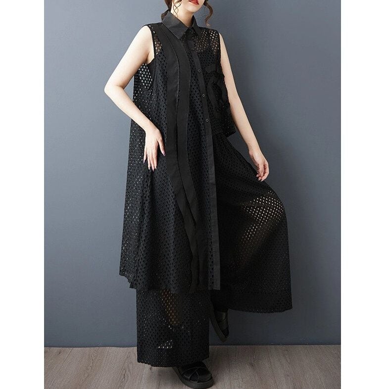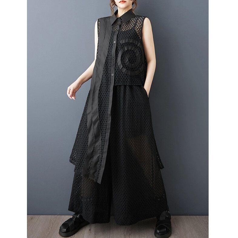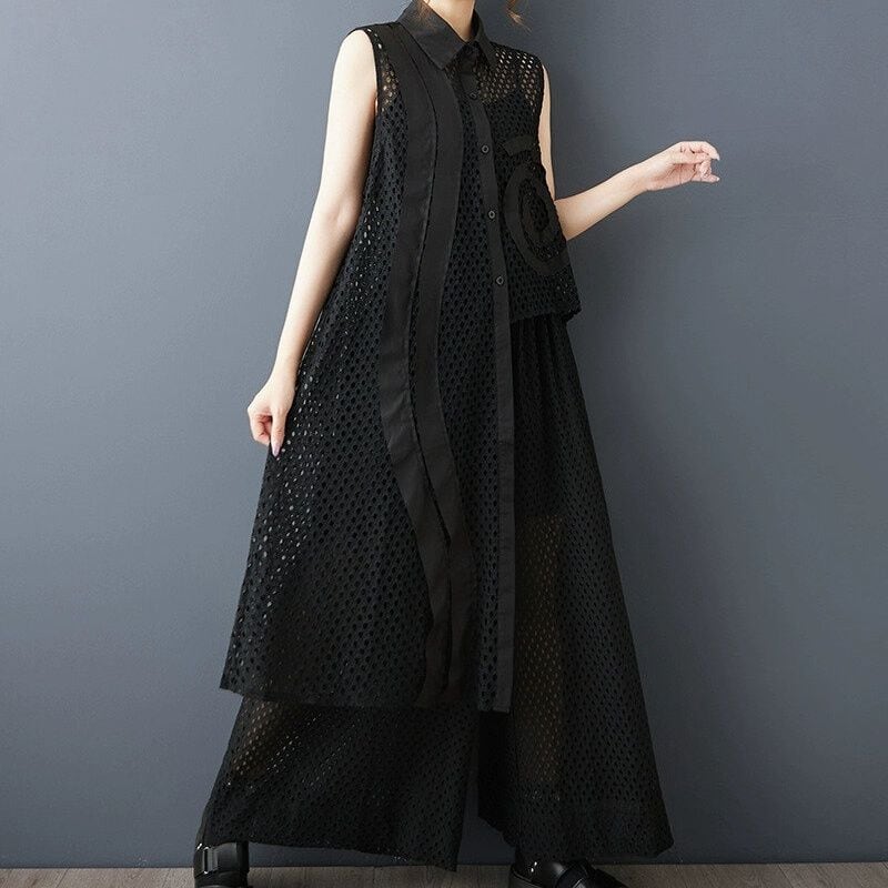 BLACK MESH ASYMMETRIC SLEEVELESS SHIRT & WIDE LEG PANTS 1color M-14175