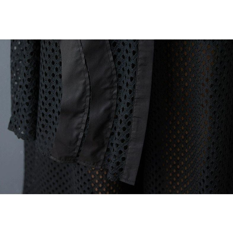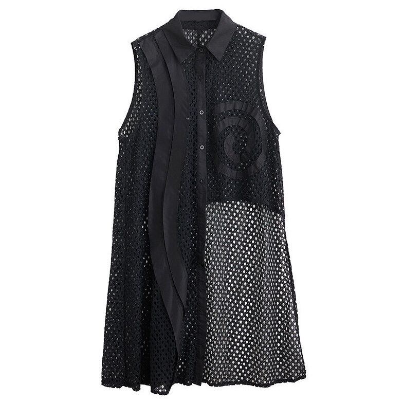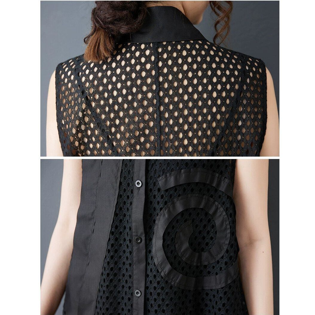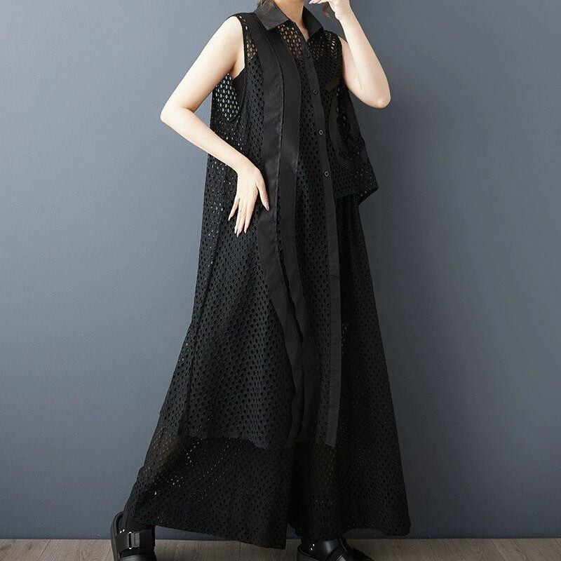 ブラックのメッシュ素材がクールな、ポロ襟・ノースリーブ・イレギュラーヘムのロングラインシャツと、ワイドレッグパンツのセットアップです。上下別売りです。シャツはスティッチをあしらった、アシンメトリックなデザインがお洒落な、Aラインシルエットが美しいアイテムです。