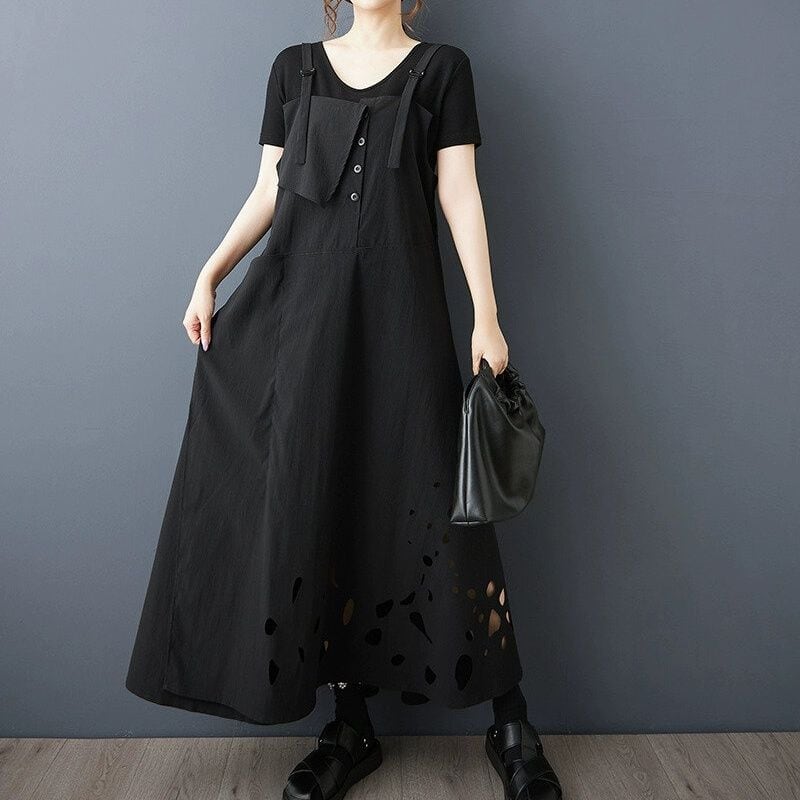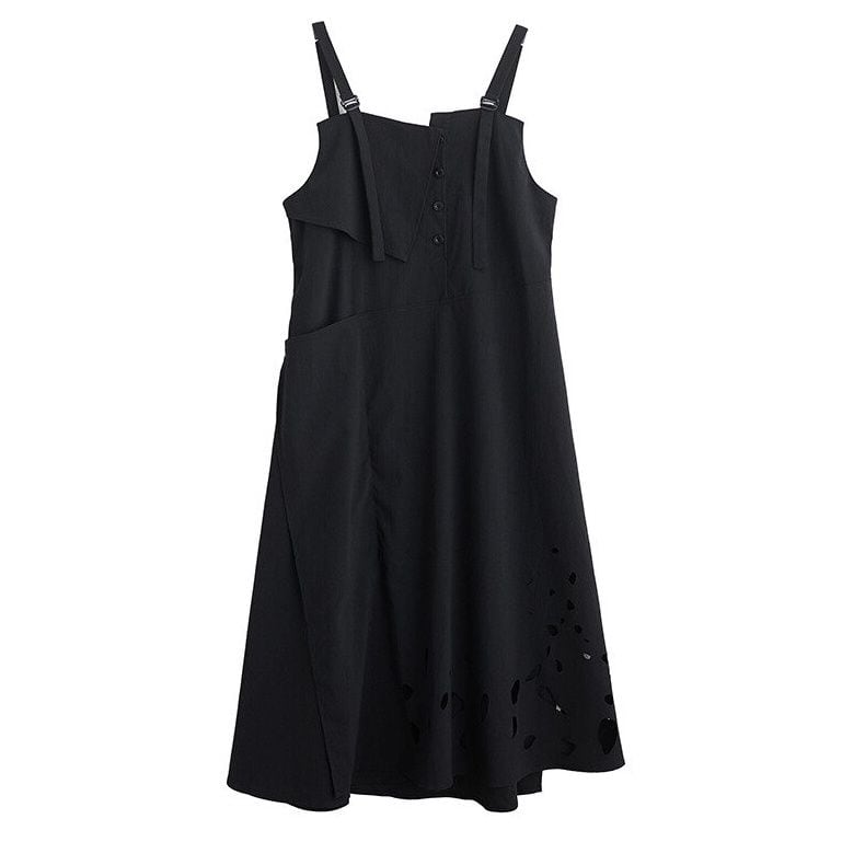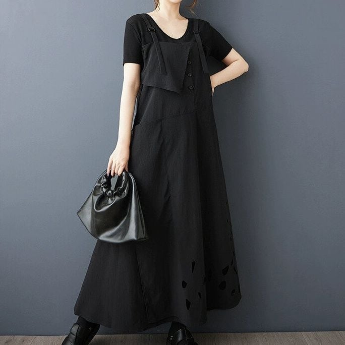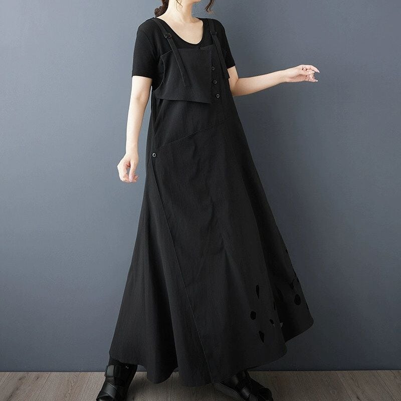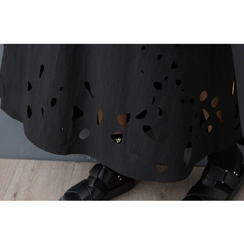 アシンメトリックなデザインがお洒落な、Aライン・ロング丈のストラップジャンパースカートです。ショルダーストラップはバックル付きで、長さを調節できます。胸当ての右サイドのフラップや左裾の花びらのようなホールがアクセントになった、シックなブラックがクールな印象のアイテムです。