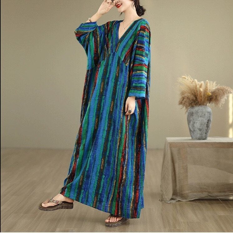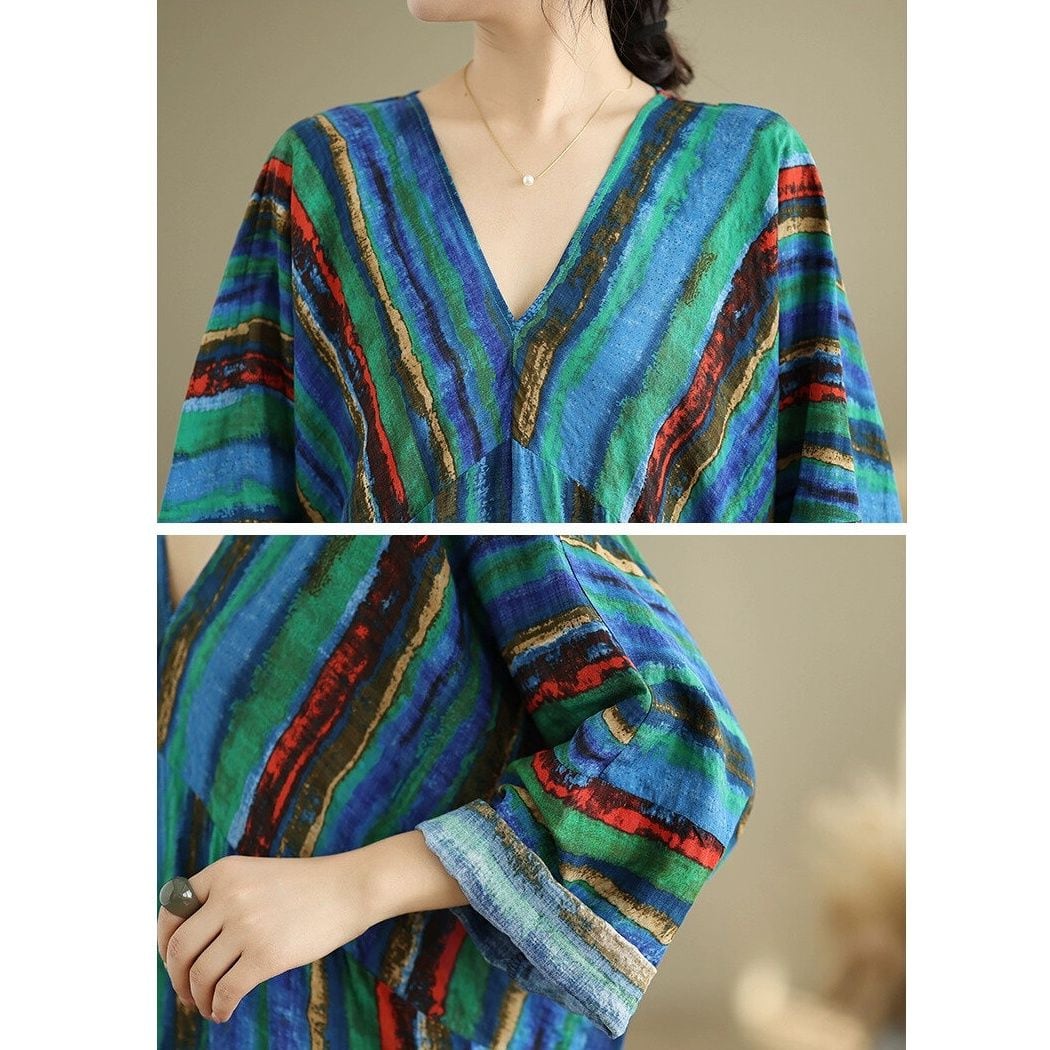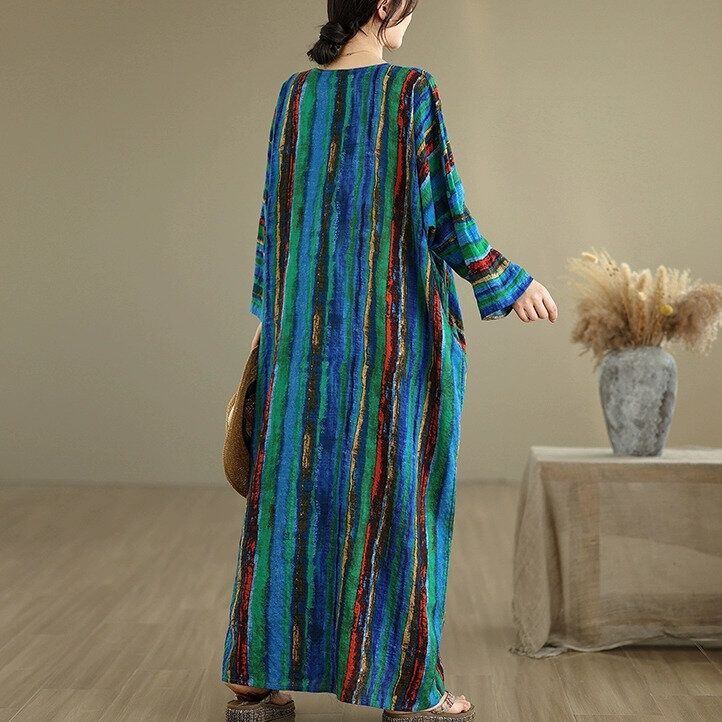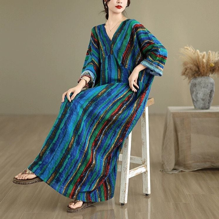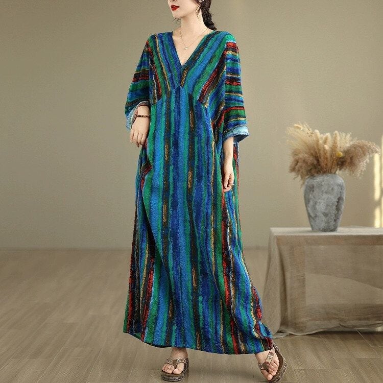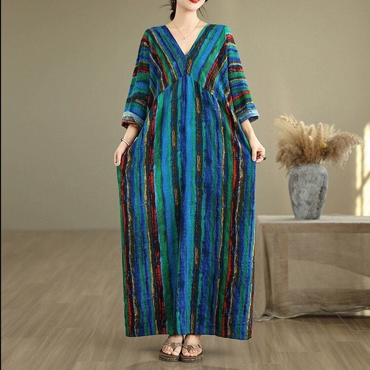 ETHNIC STRIPE V-NECK 3/4 SLEEVES MAXI PULLOVER DRESS 1color M-14183