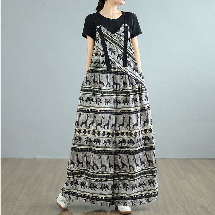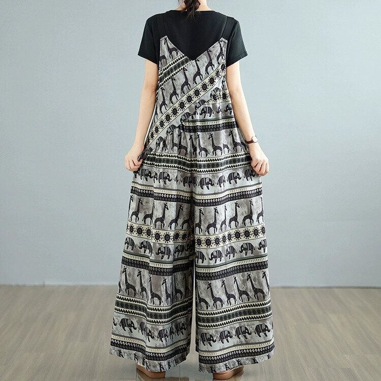 動物をモチーフにしたエスニック調のプリント生地がお洒落な、Aライン・ワイドレッグ・ジャンプスーツです。ショルダーストラップはボタンで長さを調節できます。マキシ丈のワンピースのようなシルエットが、エレガントでリラックスした雰囲気のアイテムです。2色から選べます。