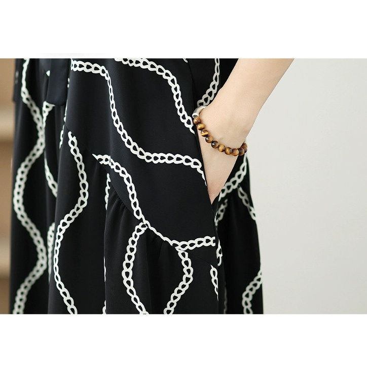 ブラックにチェーンのウェイビーなストライプがクールでお洒落な、Aライン・ワイドレッグ・ジャンプスーツです。ショルダーストラップはボタンで長さを調節できます。マキシ丈のワンピースのようなシルエットが、エレガントでリラックスした雰囲気のアイテムです。