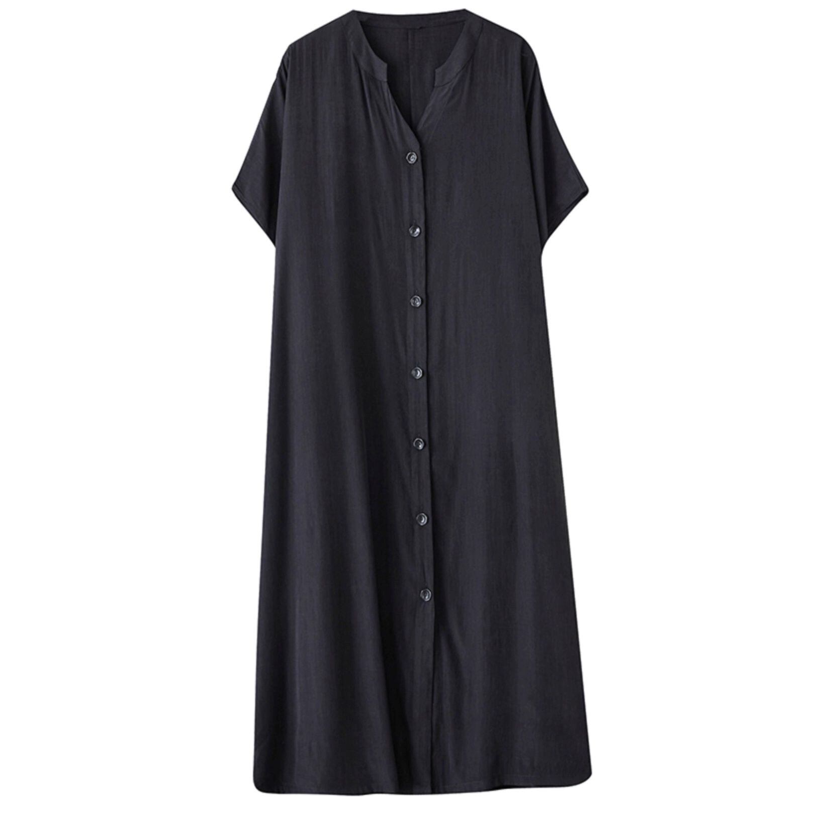 袖口とサイドが繋がったワイド幅のシルエットが特徴的な、スタンドスキッパーカラー・半袖・ロング丈のシャツワンピースです。裾はバックがフロントよりもやや長いデザインです。ブラックの単色で、アクセサリーなどの小物アレンジが利くアイテムです。