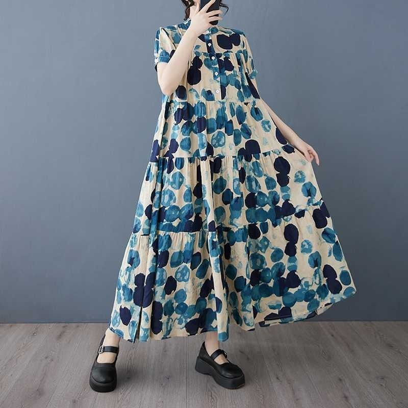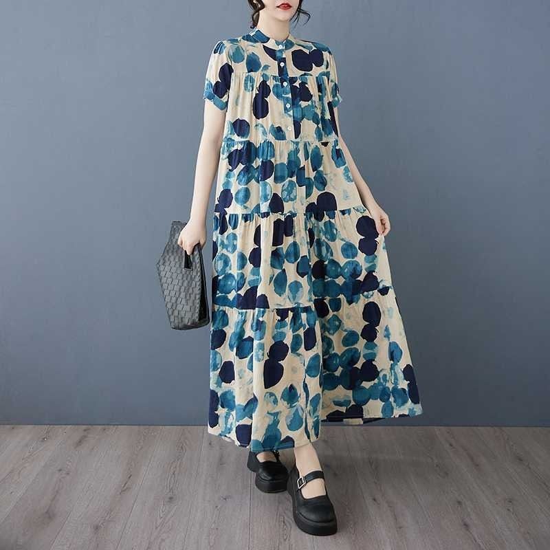 ブルーのデザインドットが涼し気で可愛らしい、スタンドカラー・ハーフボタン・半袖・ロング丈のシャツワンピースです。裾に向かって徐々に広がるティアードデザインで、シルエットが美しい目を惹くアイテムです。
