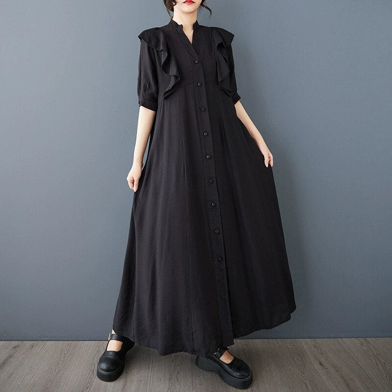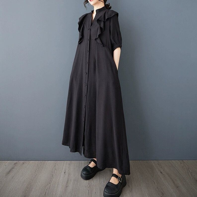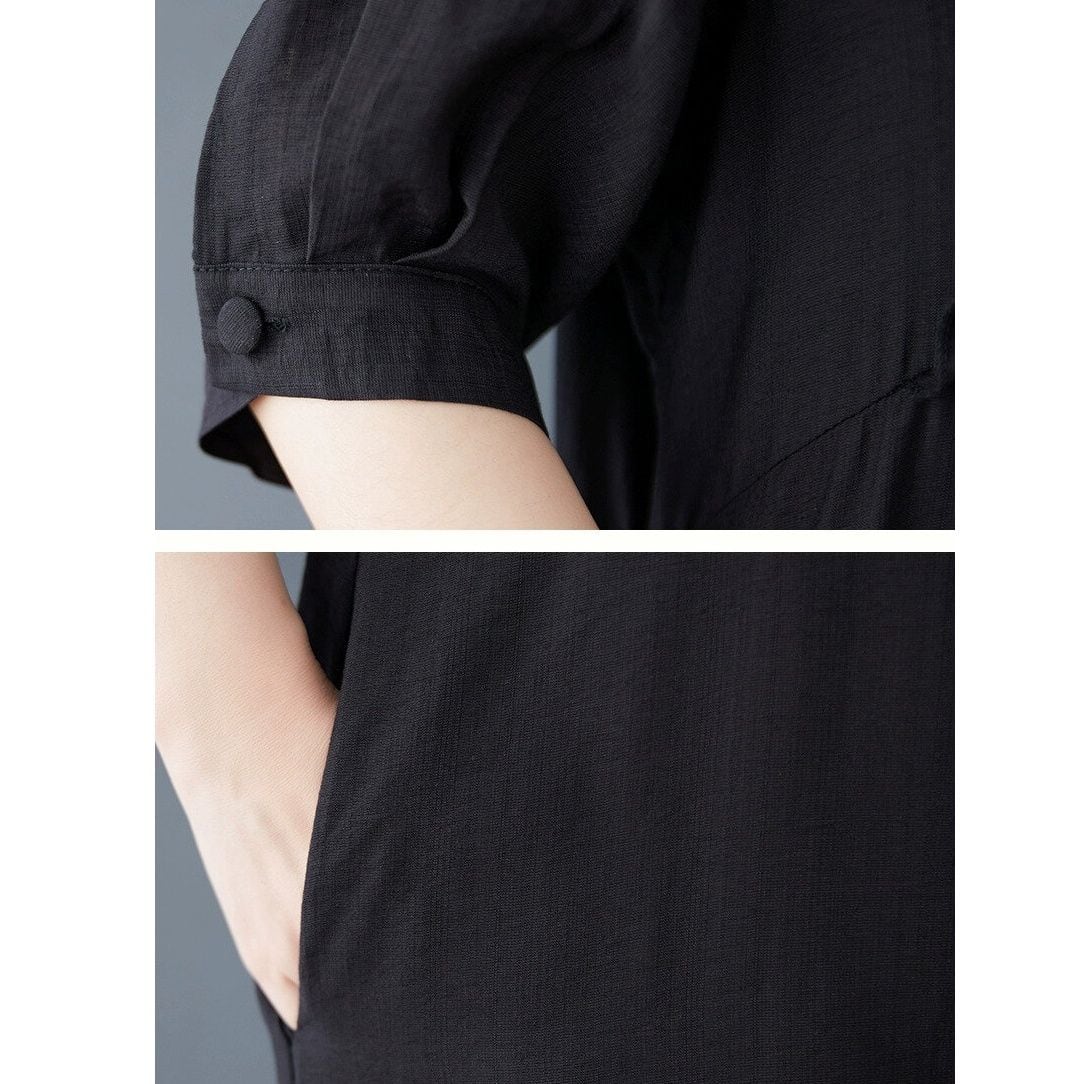 BLACK STAND COLLAR HALF SLEEVES LONG SHIRT DRESS 1color M-14208