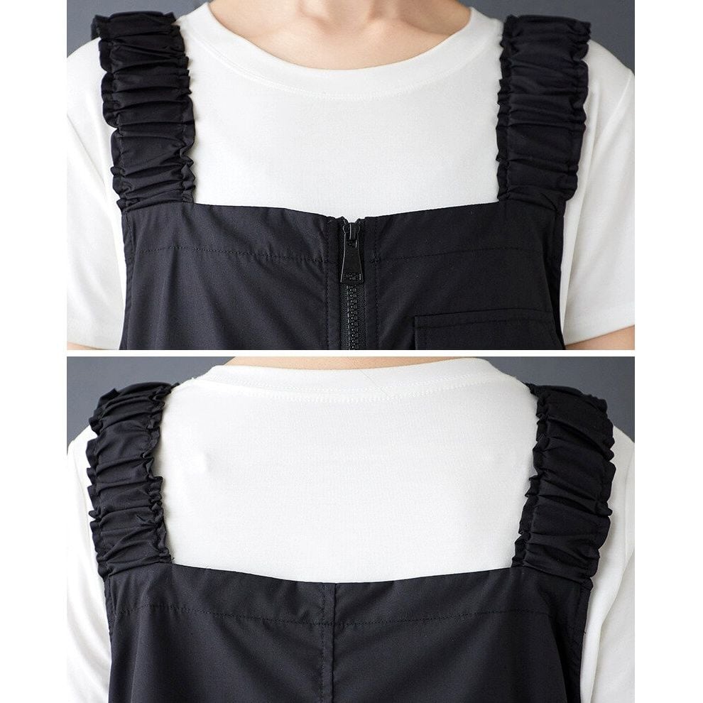立体的なポケットやウエストのドローコードが特徴的な、ブラックのAライン・ロング丈・ジャンパースカートです。フロントセンターのジップラインがアクセントになった、コーディネートしやすいクールな印象のアイテムです。