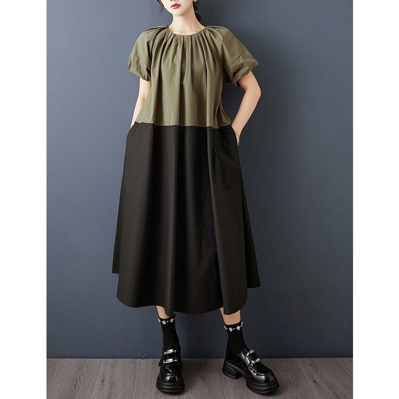 カーキとブラックの上下のコントラストデザインがお洒落な、ラウンドネック・半袖・ミドル丈のデザインワンピースです。プリーツの入ったネックやバルーン状になったパフスリーブなど、シルエットがガーリーでキュートな印象のアイテムです。