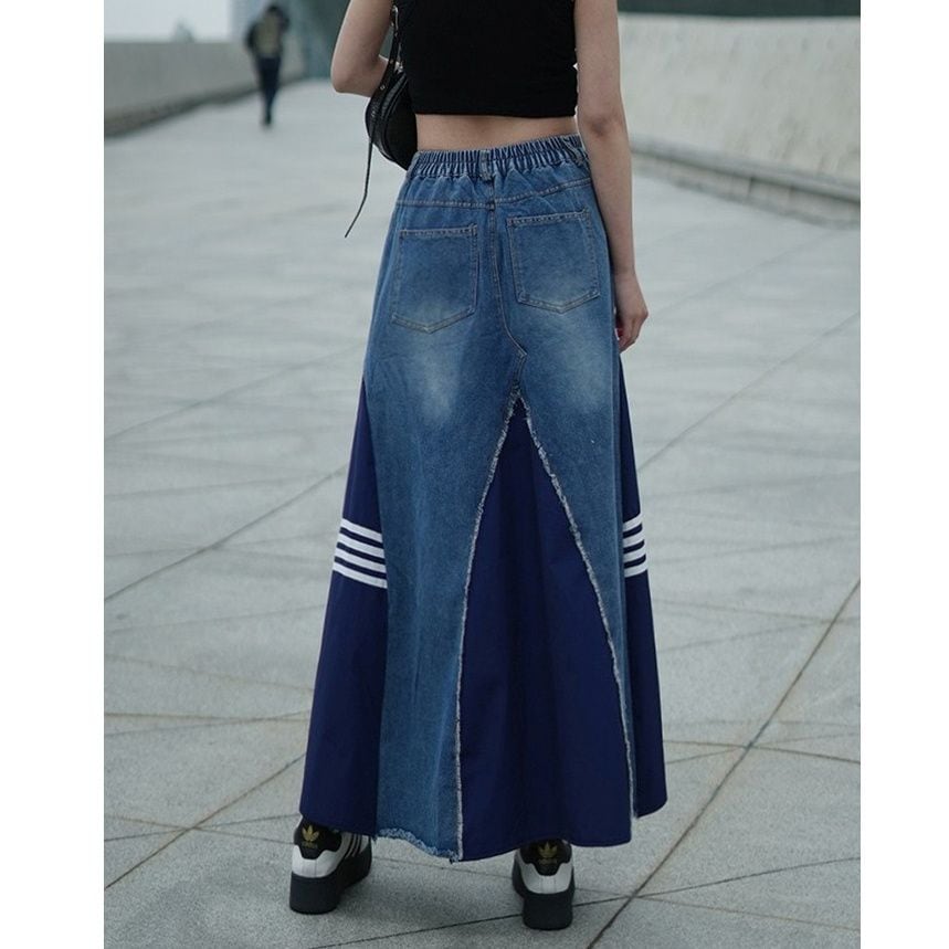 ブルーデニムとカラー生地のスティッチデザインが目を惹く、Aライン・ロング丈のデザインスカートです。ウエストは後ろ半分がゴムなので、履き心地が良いです。サイドの白い3本ラインがアクセントになった、クールなカジュアルアイテムです。3色から選べます。
