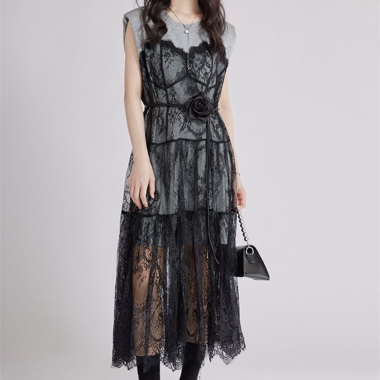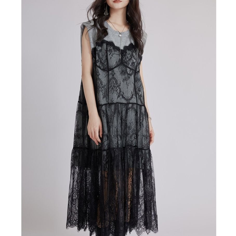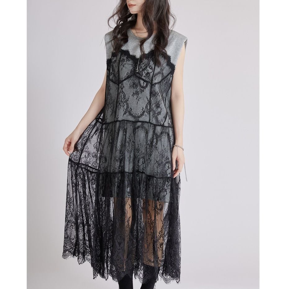 ブラックの繊細なレースが美しい、ラウンドネック・ノースリーブ・ロング丈のプルオーバーワンピースです。グレーとブラックのコントラストがお洒落な、Aラインシルエットが魅力的なアイテムです。
