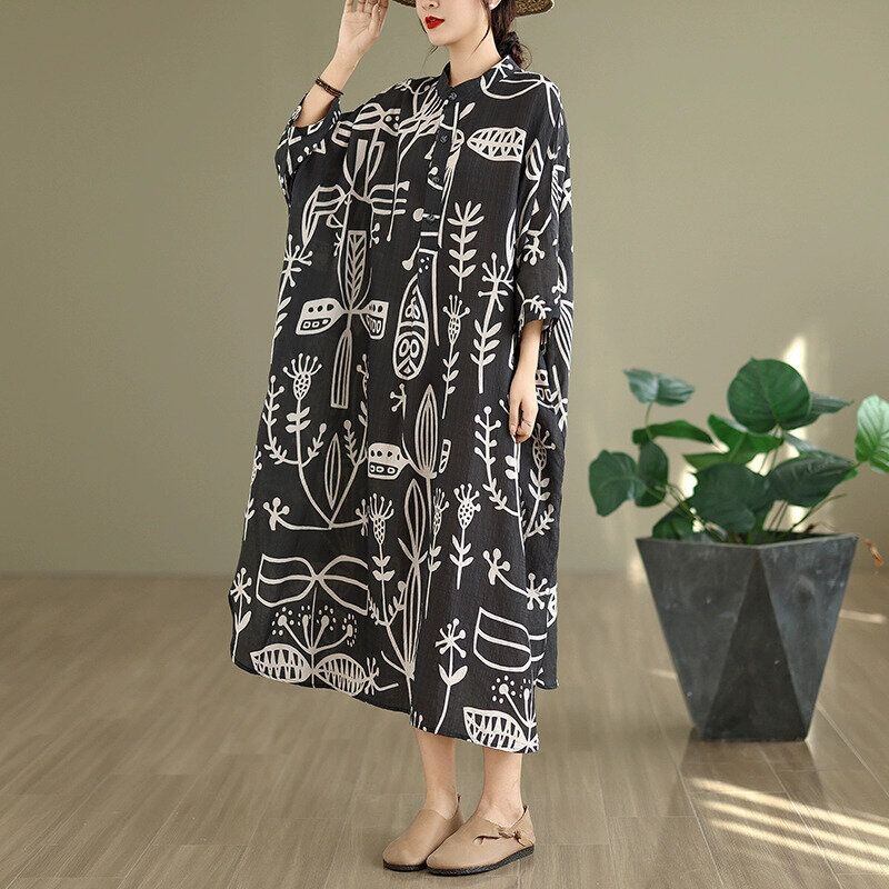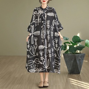 PRINT STAND COLLAR 3/4 SLEEVES WIDE MIDI SHIRT DRESS 1color M-14251