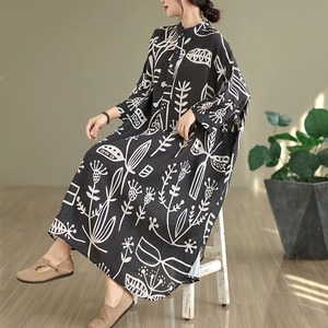 北欧風のイラストプリントがキュートな、スタンドカラー・ハーフボタン・7分袖・膝下丈のシャツワンピースです。ゆったりとしたワイド幅で、ラウンドカットの裾はサイドがスリットの様です。エレガントでリラックスした印象のアイテムです。