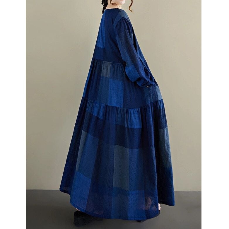 BLUE CHECKERED BOAT NECK LONG SLEEVES A-LINE MAXI DRESS 1color M-14252