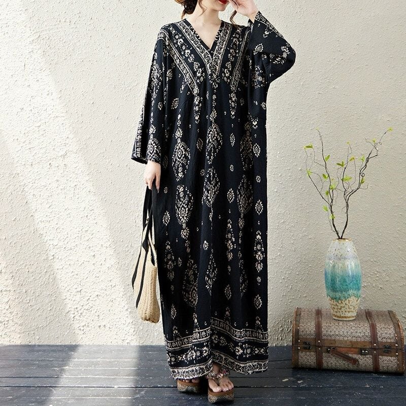 ブラック地にエスニックな柄が魅力的な、Vネック・長袖・マキシ丈のプルオーバーワンピースです。ワイド幅のゆったりとしたシルエットが、エレガントでリラックスした雰囲気のアイテムです。