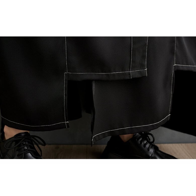 ブラック地にホワイトのスティッチラインがアクセントになった、ポロ襟・長袖・マキシ丈のシャツワンピースです。イレギュラーな裾のラインやバックのスリットが特徴的な、ゆったりとしたシルエットのカジュアルアイテムです。