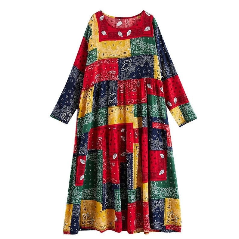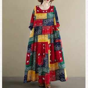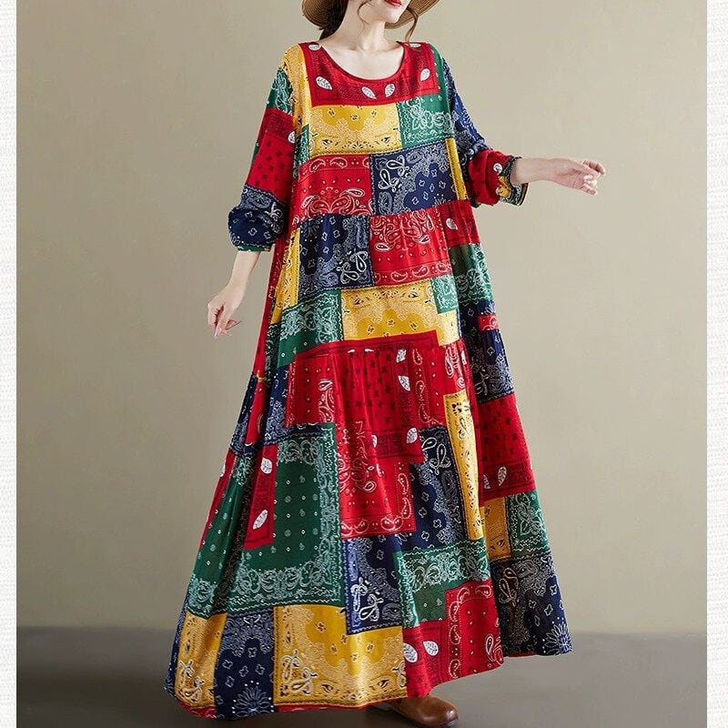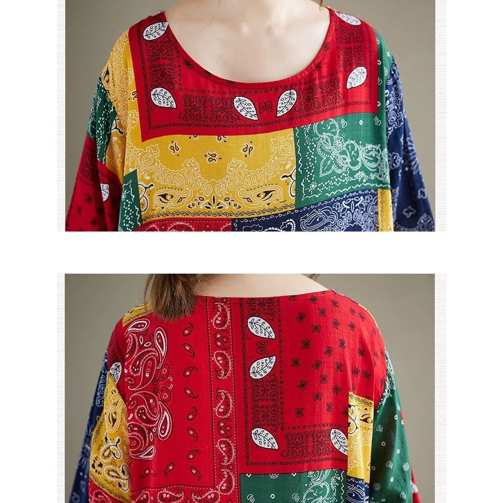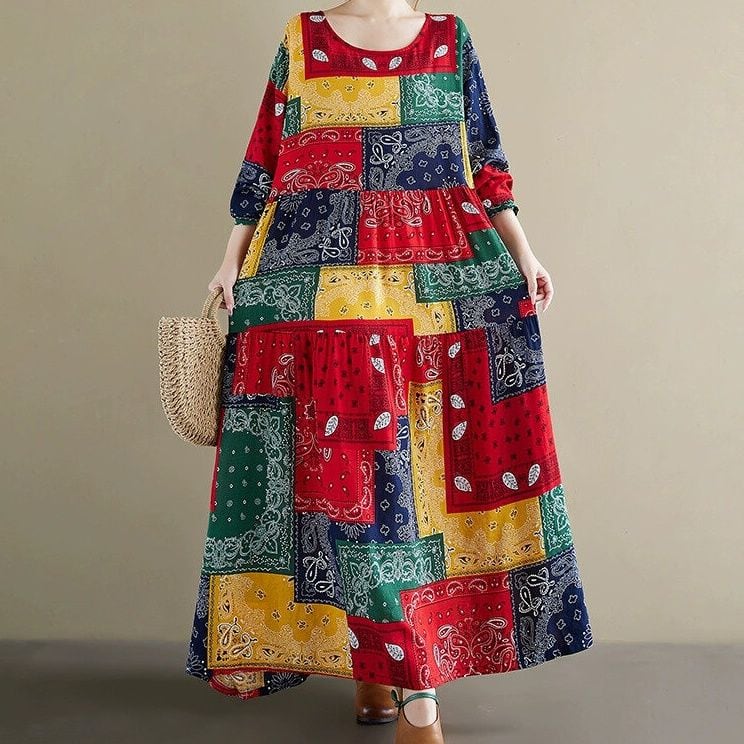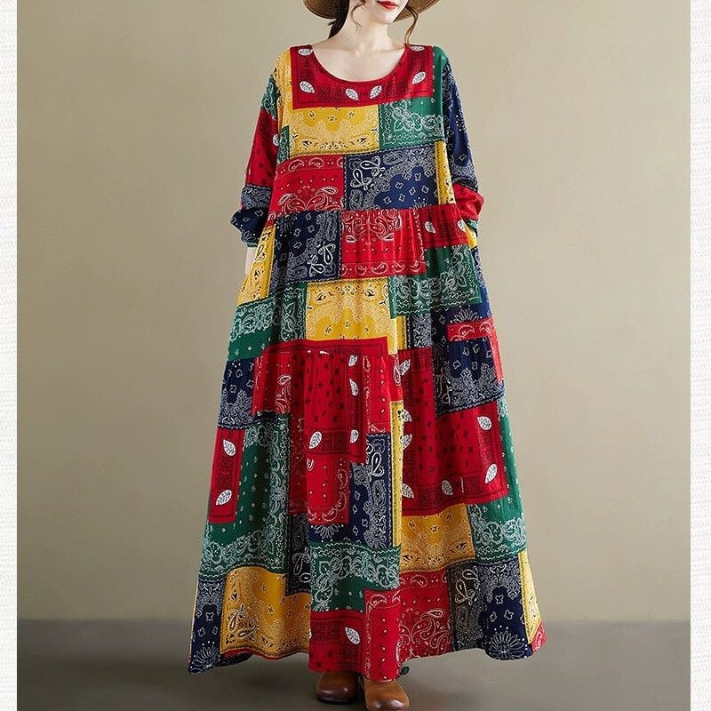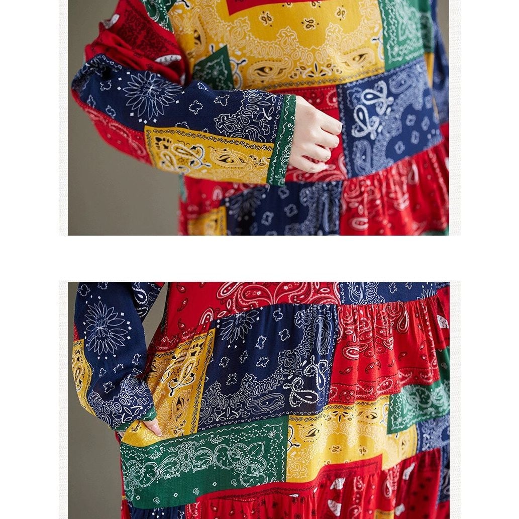 バンダナをパッチワークしたようなカラフルな柄生地が目を惹く、ボートネック・長袖・マキシ丈のプルオーバーワンピースです。2段の切り返しでギャザーの入った、ゆったりとしたシルエットが魅力的なカジュアルアイテムです。