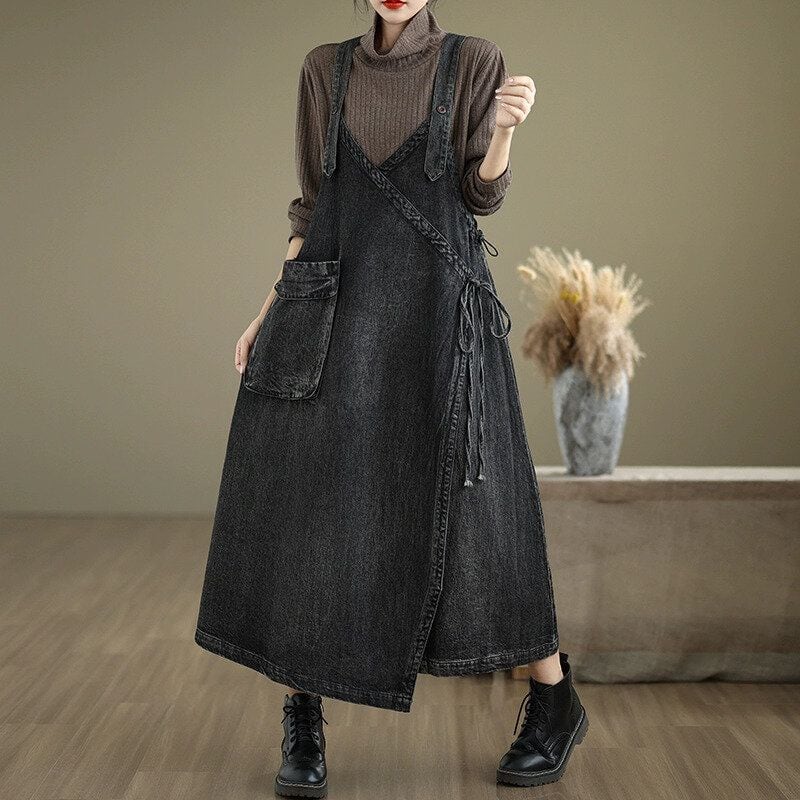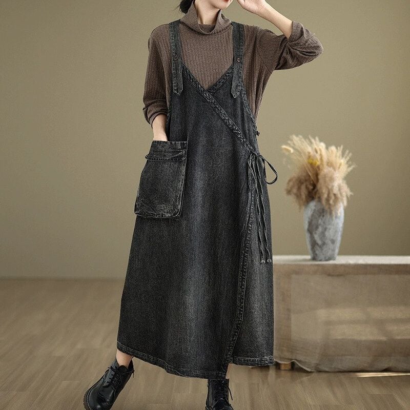 DENIM 3D POCKET A-LINE MIDI STRAP JUMPER DRESS 2colors M-14277