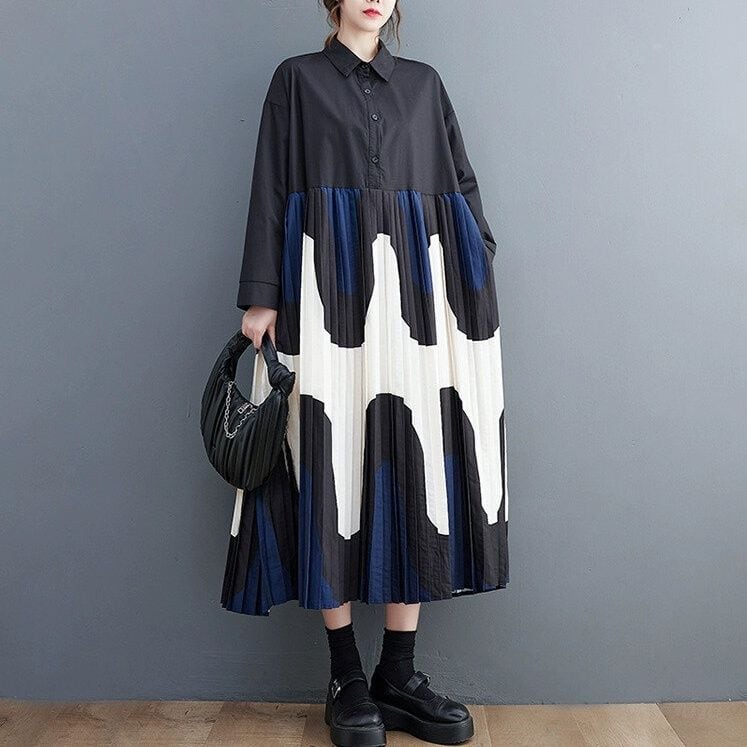 ブラックの単色とプリーツ加工の柄生地のスティッチデザインがお洒落な、ポロ襟・長袖・膝下丈のシャツワンピースです。ゆったりとしたAラインのシルエットが魅力的な、目を惹くアイテムです。