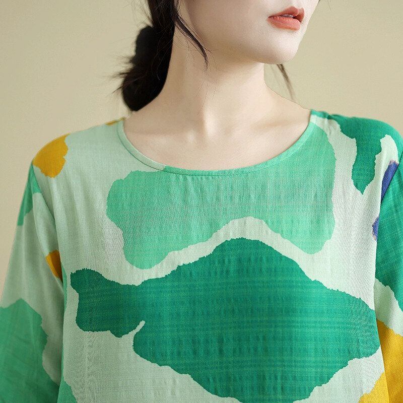 グリーンベースの北欧風の柄生地がキュートな、ボートネック・長袖・マキシ丈のプルオーバーワンピースです。ウエストの切り返しでギャザーの入ったゆったりとしたシルエットが、リラックスした印象のカジュアルアイテムです。