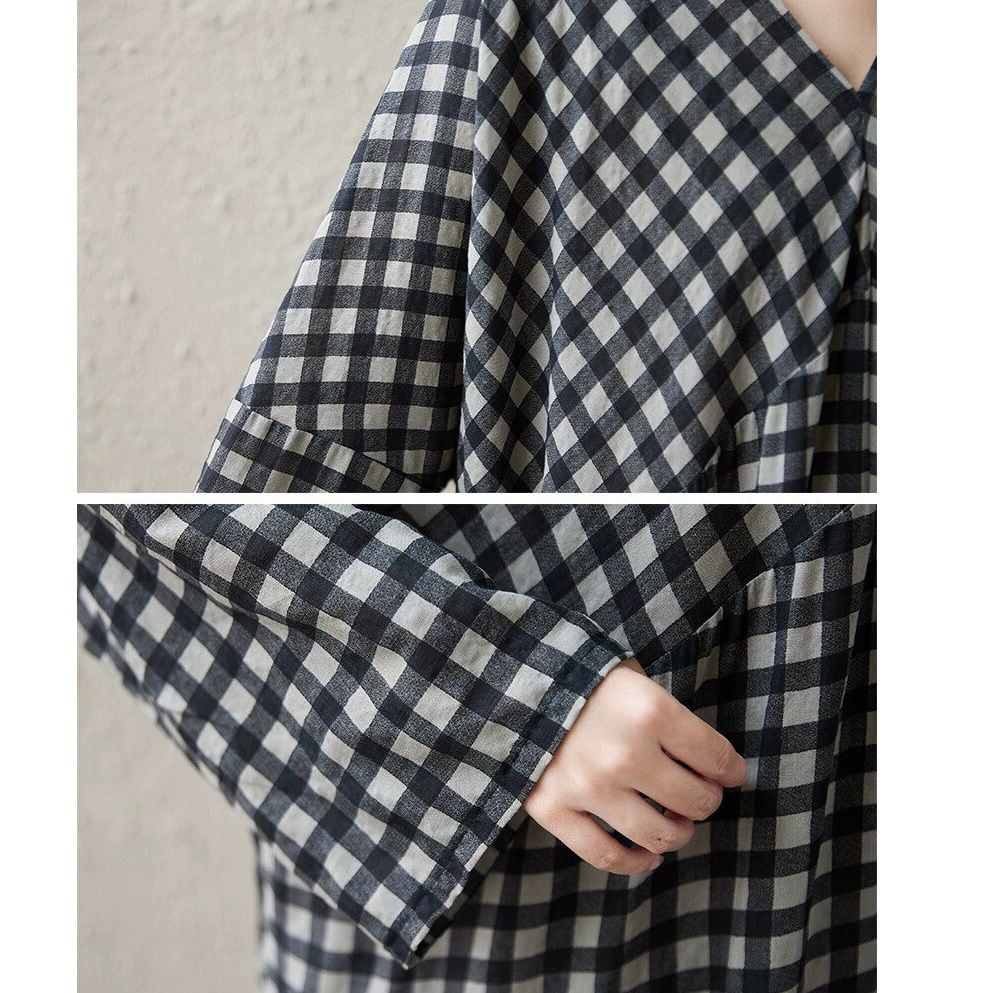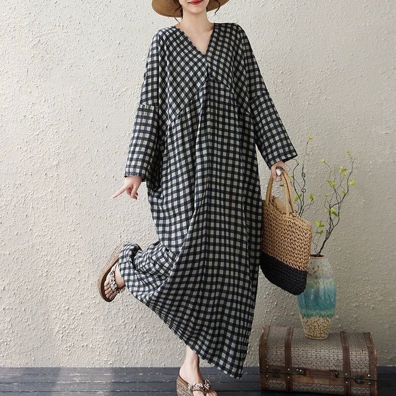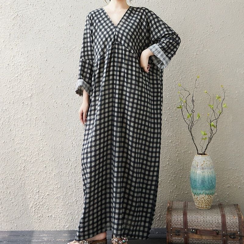 CHECKERED V-NECK LONG SLEEVES MAXI PULLOVER DRESS 1color M-14292