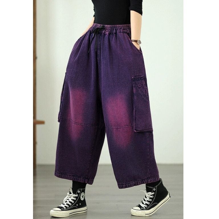 色落ち加工のカラーデニムが魅力的な、Vネック・長袖・カーディガンジャケットとワイドレッグ・クロップドパンツのセットアップです。パンツのウエストはドローストリングなので、着脱が簡単で履き心地が良いです。大きなポケットやデザインボタンがお洒落な、ゆったりとしたシルエットのカジュアルアイテムです。グリーンとパープルの2色から選べます。
