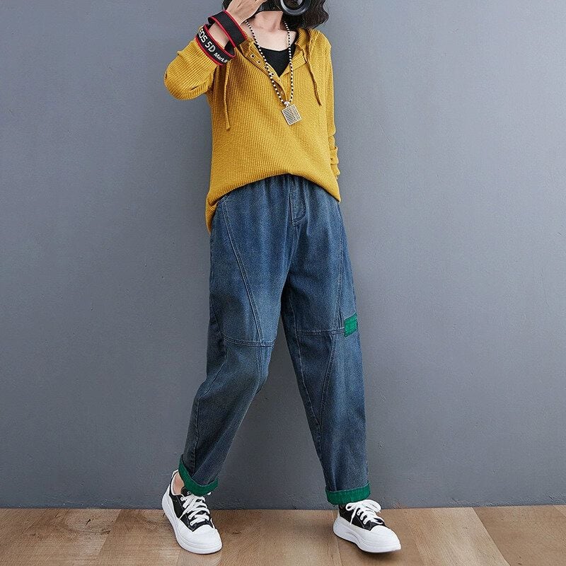 グリーンのパッチや裾がアクセントになった、キャロットスタイルのデニムパンツです。ウエストはゴムなので、着脱が簡単で履き心地が良いです。何にでも合わせやすい、レトロでキュートな印象のアイテムです。