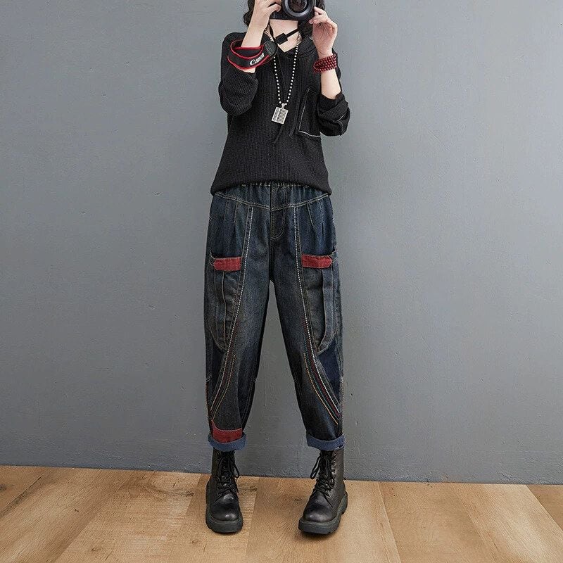 レッドのパッチやカラフルな糸を使ったスティッチラインがキュートな、キャロットスタイルのデニムパンツです。ウエストはゴムなので、着脱が簡単で履き心地が良いです。コーディネートの主役になる、レトロな印象の目を惹くアイテムです。