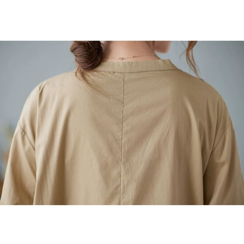 シンプルなデザインが魅力的な、襟なし・長袖・ロング丈のシャツワンピースです。バックのボックスプリーツが作り出すAラインのシルエットが、エレガントで美しいアイテムです。ブラックとカーキの2色から選べます。
