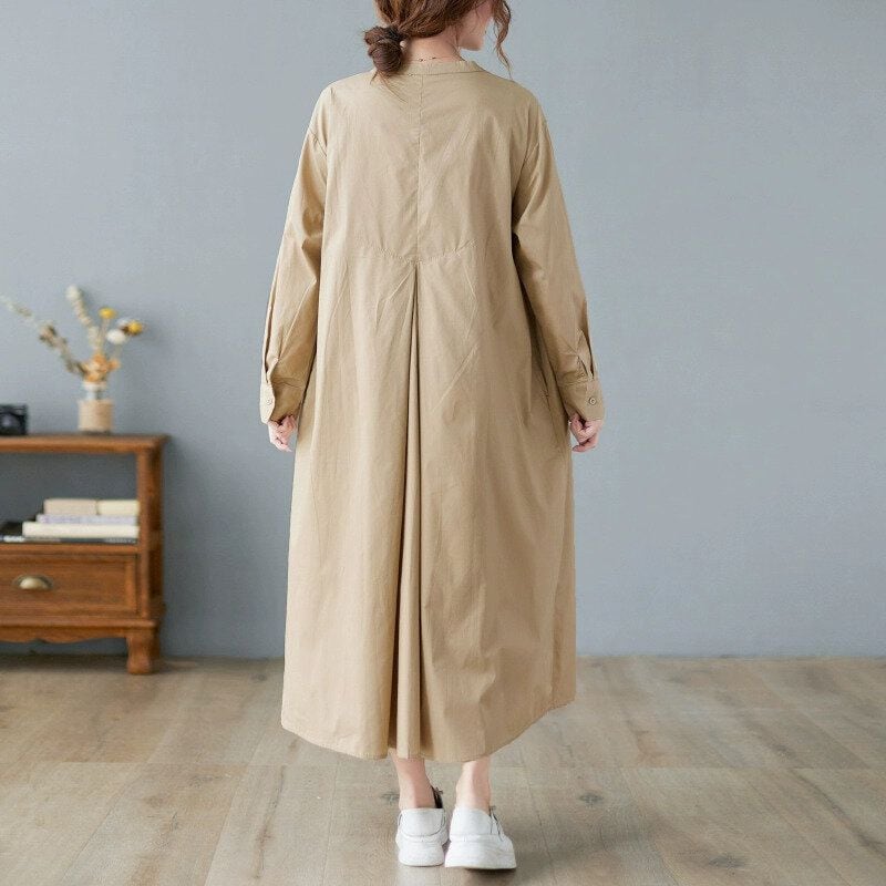 SOLID COLLARLESS LONG SLEEVES A-LINE LONG SHIRT DRESS 2colors M-14311