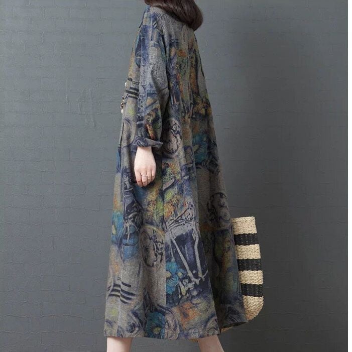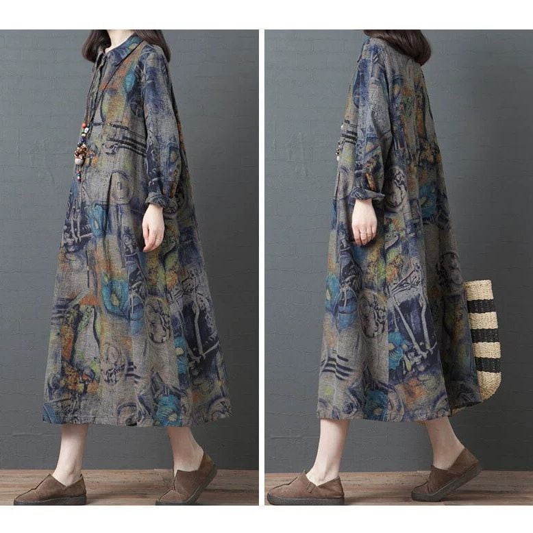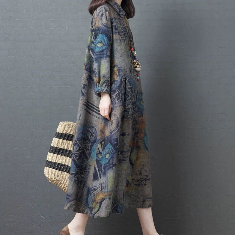 色褪せた加工のプリントが美しい、ラウンドカラー・ハーフボタン・長袖・膝下丈のシャツワンピースです。お洒落なボタンがアクセントになった、ゆったりとしたシルエットがエレガントなアイテムです。