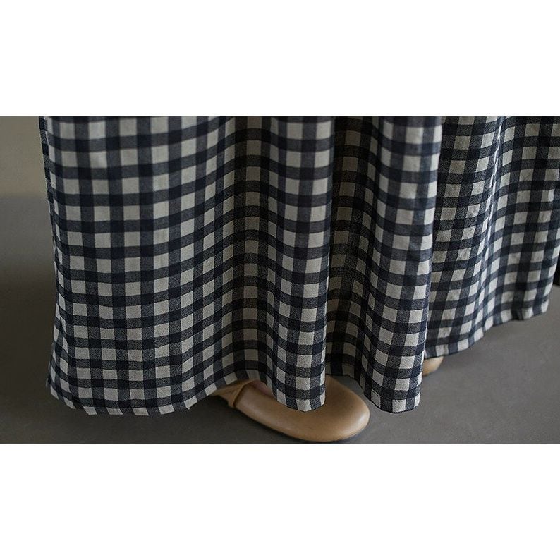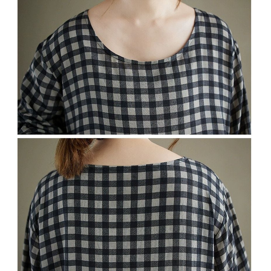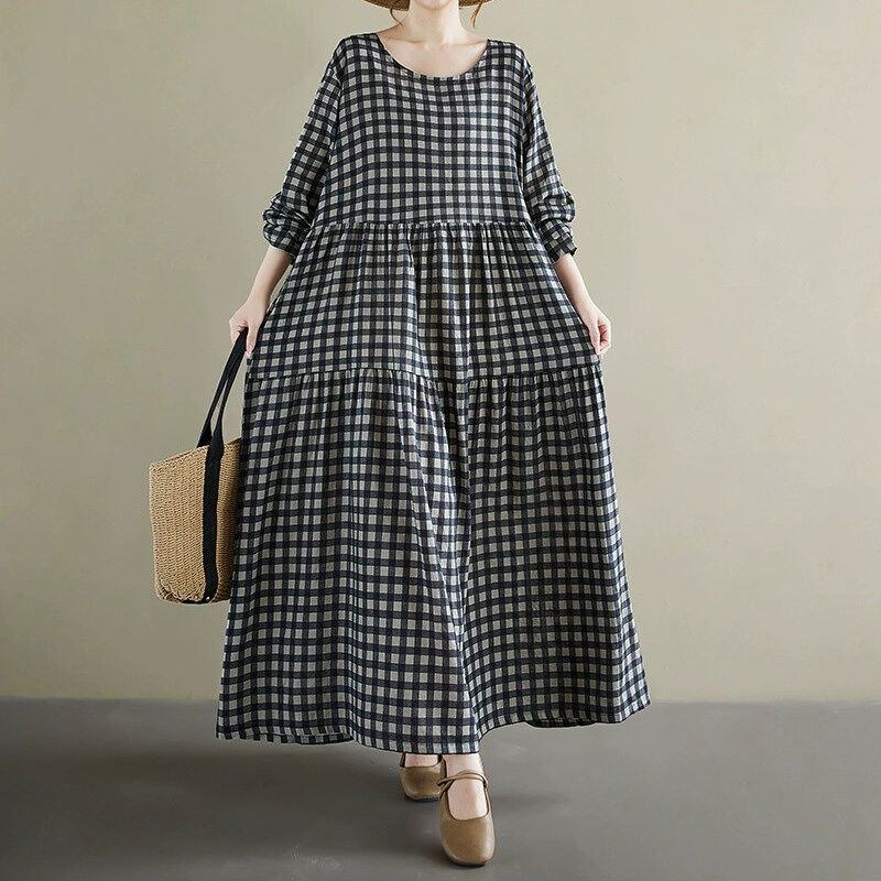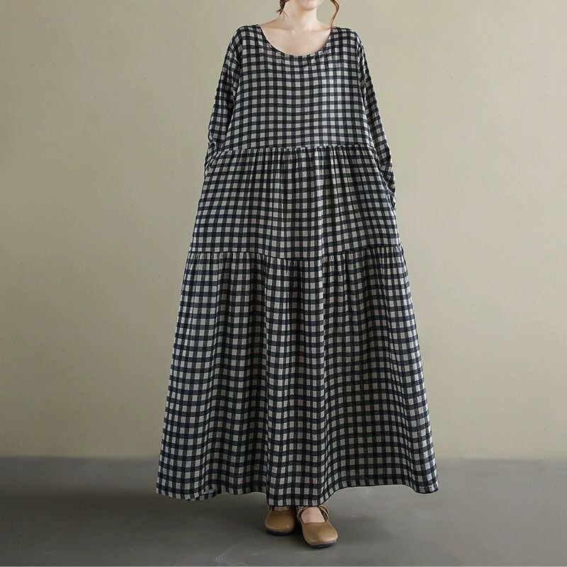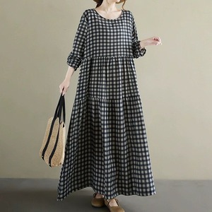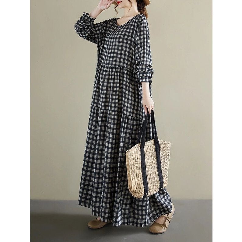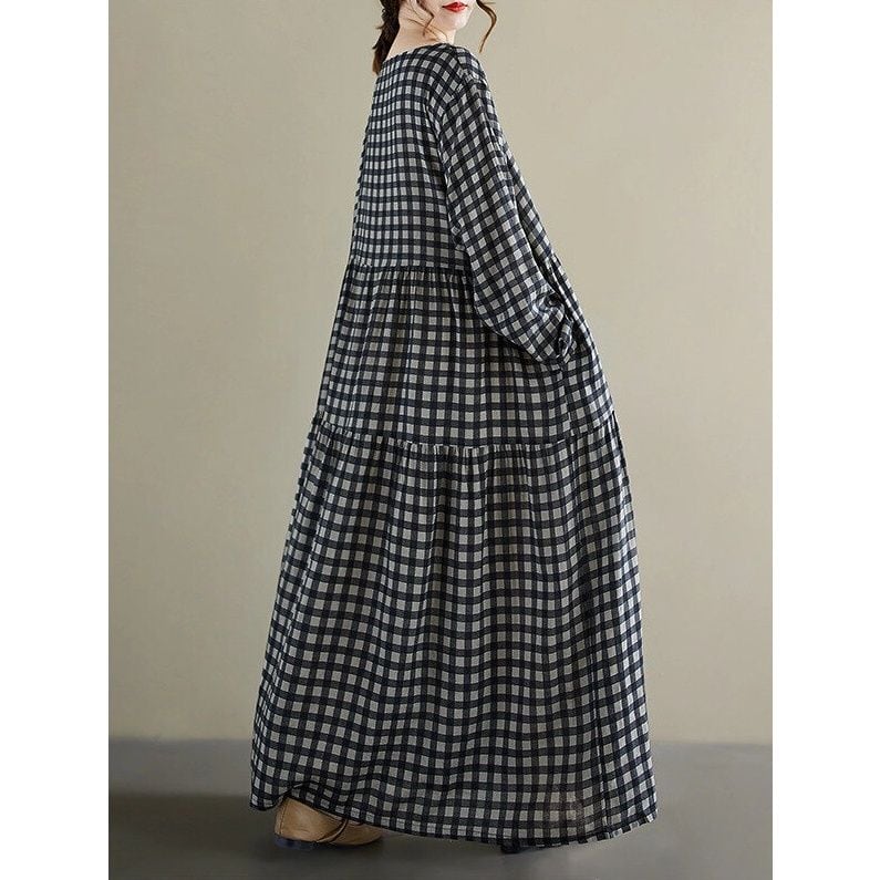 CHECKERED BOAT NECK LONG SLEEVES MAXI PULLOVER DRESS 1color M-14316