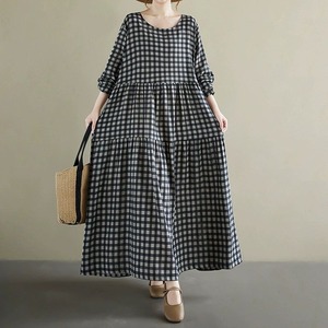 グレー地にブラックのギンガムチェックがお洒落な、ボートネック・長袖・マキシ丈のプルオーバーワンピースです。2段の切り返しでギャザーの入った、ゆったりとしたシルエットが魅力的なカジュアルアイテムです。