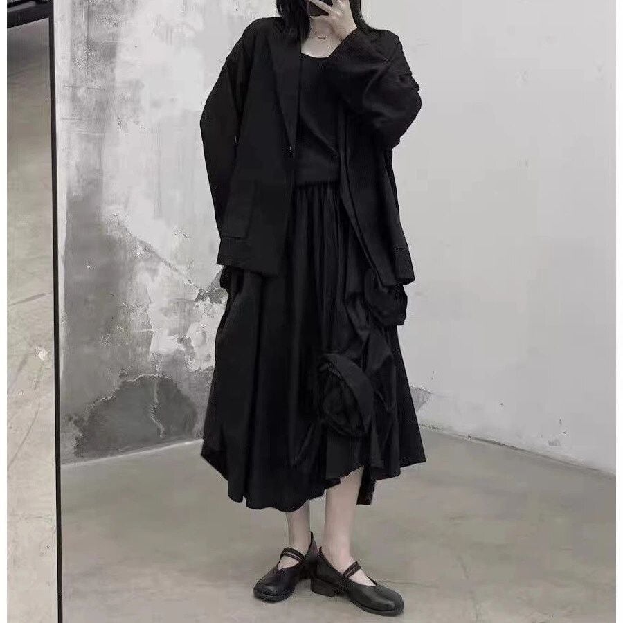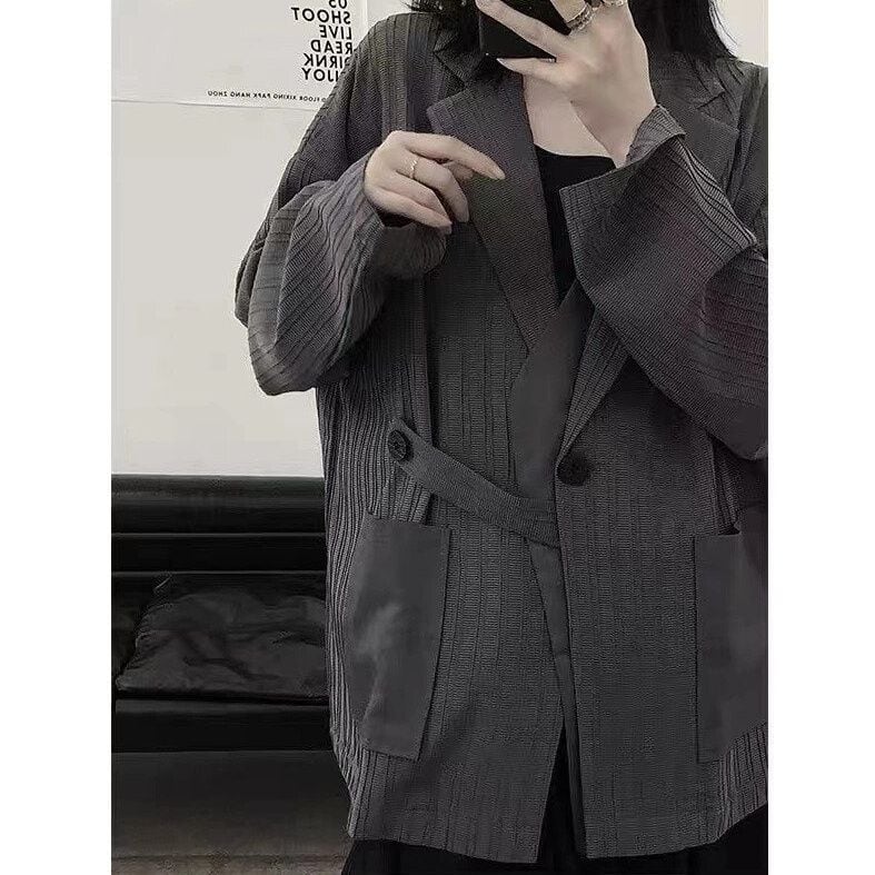 スティッチやストラップベルトのデザインがお洒落な、ブレザー型のデザインジャケットです。単色とオーバーサイズのシルエットでコーディネートしやすい、モードな印象のアイテムです。ブラックとグレーの2色から選べます