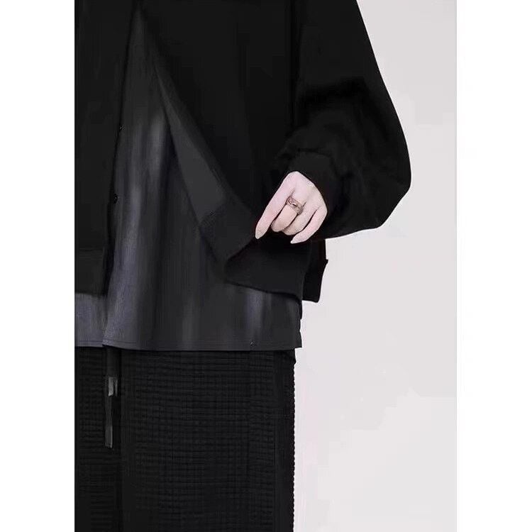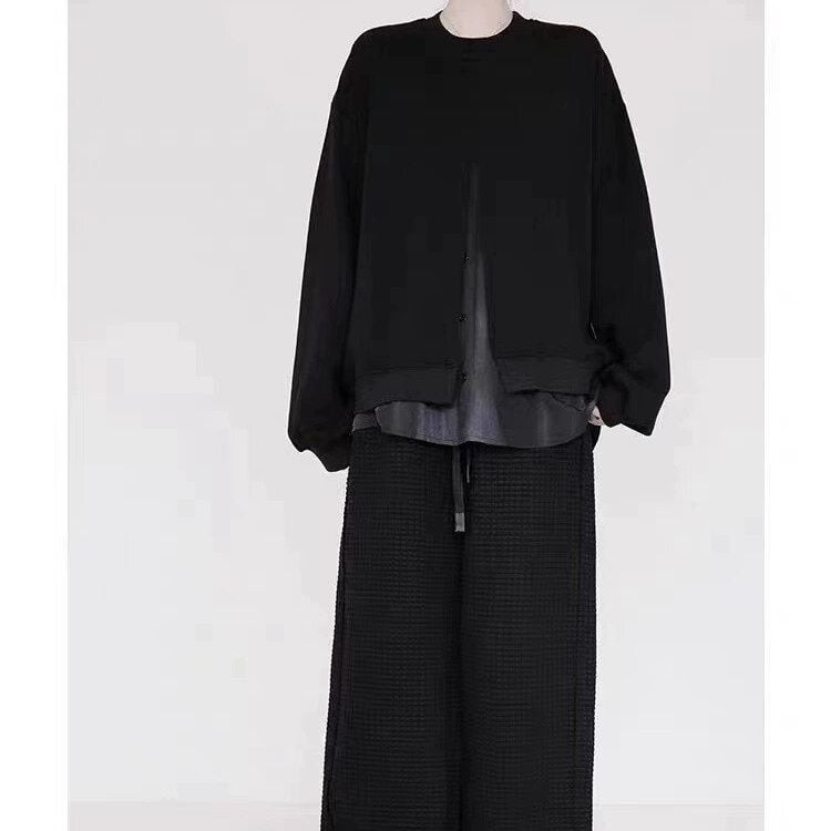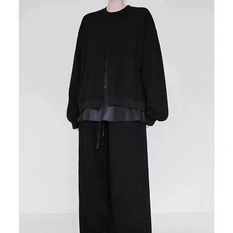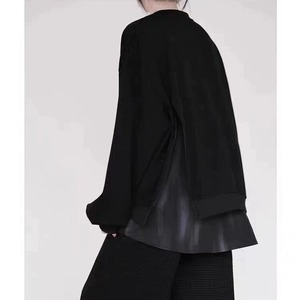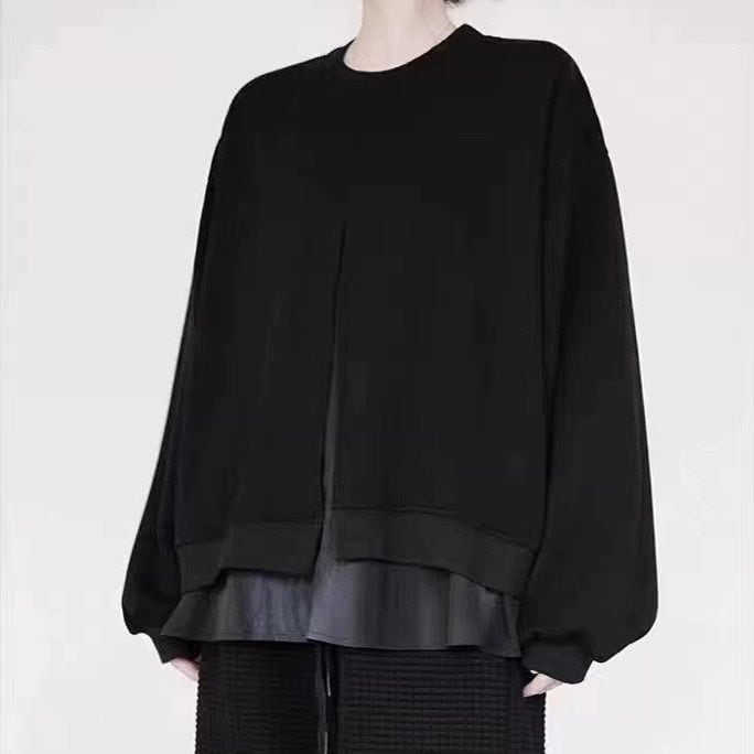 インナーにシャツを合わせたようなフェイクツーピースデザインの、ラウンドネック・長袖・プルオーバートップです。ゆったりとしたシルエットに深いスリット柄のぞくデザインシャツがお洒落な、ブラックでコーディネートしやすいアイテムです。