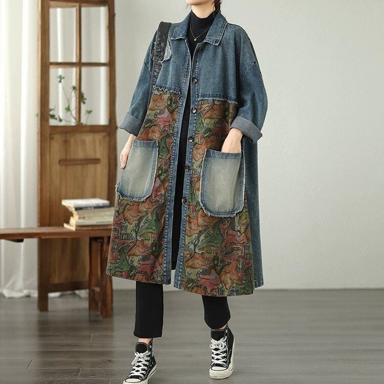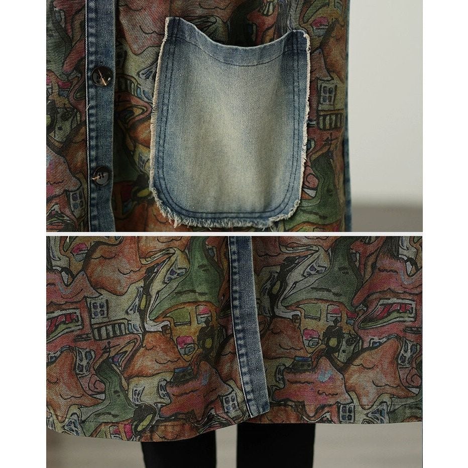 イラストプリントのスティッチデザインが目を惹く、ポロ襟・長袖・ミドル丈のデニムコートです。色落ち加工生地のパッチやポケットがアクセントになった、コーディネートの主役になるカジュアルアイテムです。