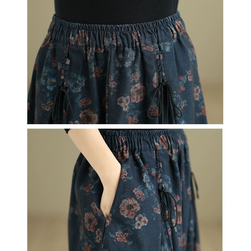 濃いブルーのデニムに花柄プリントがキュートな、Aライン・ロング丈のカジュアルスカートです。ウエストはゴムなので、着脱が簡単で履き心地が良いです。ボックスプリーツを作る紐のリボンがアクセントになった、コーディネートの主役になるアイテムです。