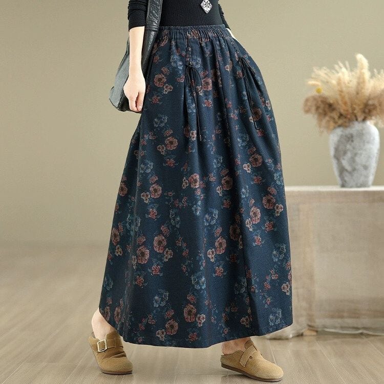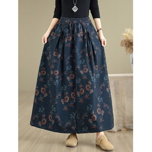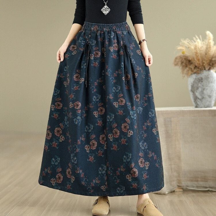 FLOWER PRINT BLUE DENIM A-LINE LONG SKIRT 1color M-14332