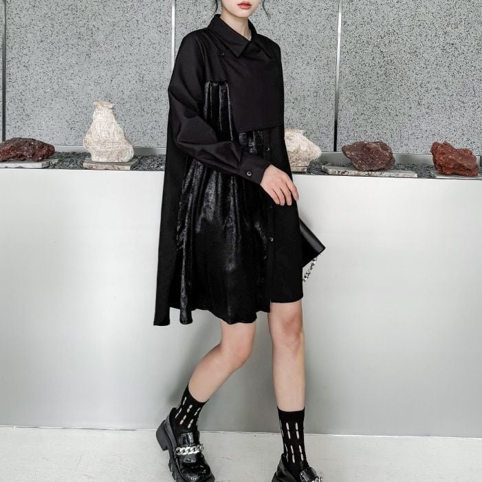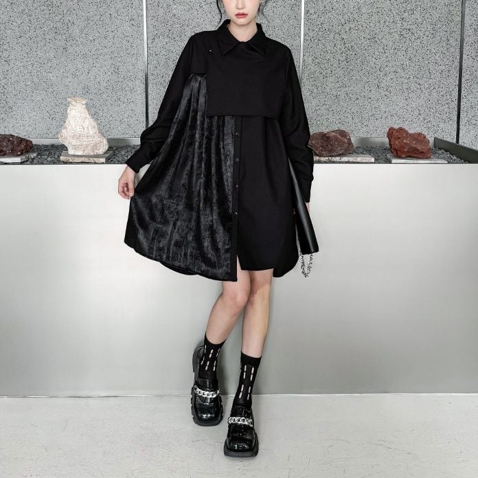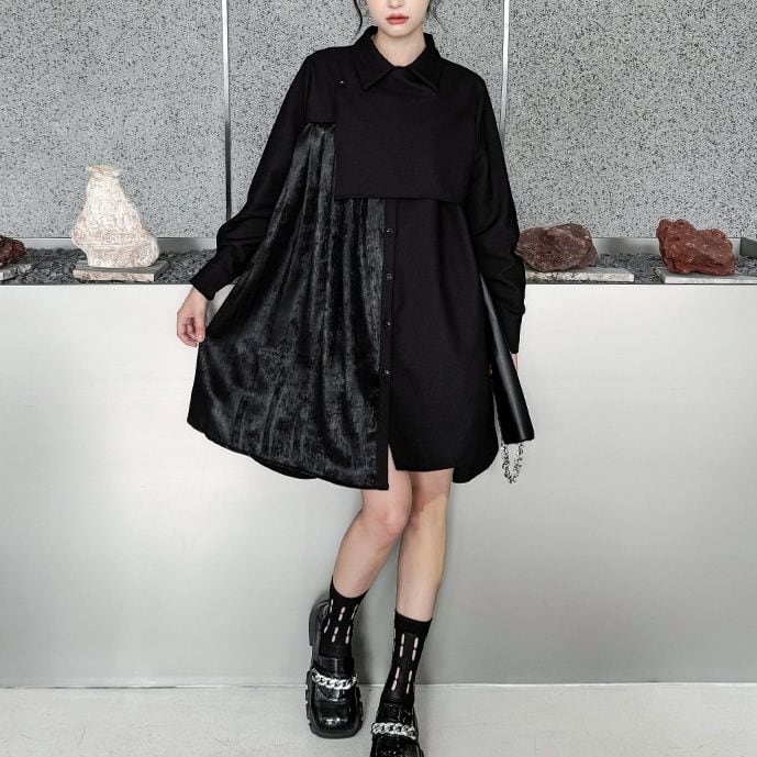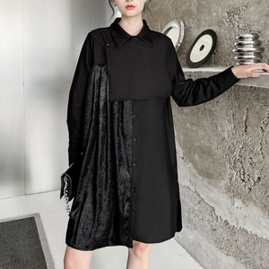 BLACK VELVET STITCH LONG SLEEVES MINI SHIRT DRESS 1color M-14346