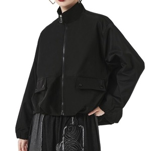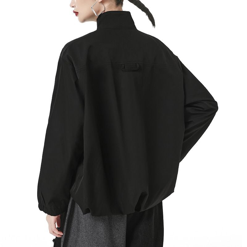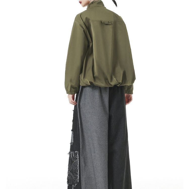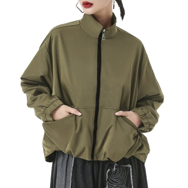 バルーンのようなシルエットの裾がお洒落な、スタンドカラー・長袖・フルジップのカジュアルジャケットです。単色とシンプルなデザインが使いやすい、クールな印象のアイテムです。ブラックとアーミーグリーンの2色から選べます。