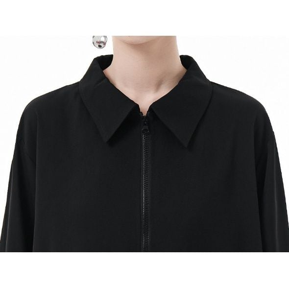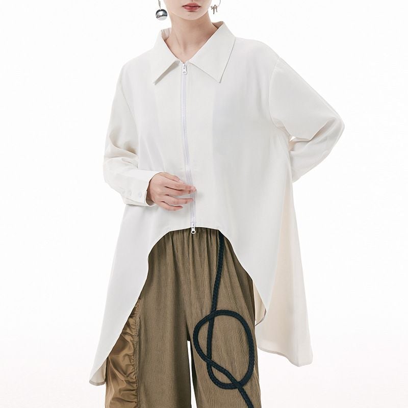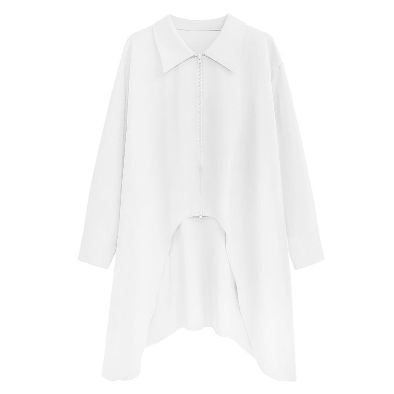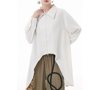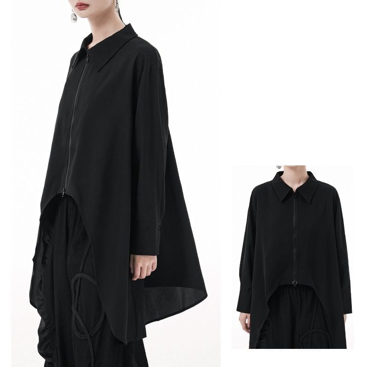 弧を描くように切り抜かれた裾のラインが特徴的な、ポロ襟・長袖・イレギュラーヘムのロングラインシャツです。単色にダブルジップでシャツジャケットとしても使える、目を惹くデザインのアイテムです。色は3色から選べます。