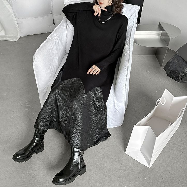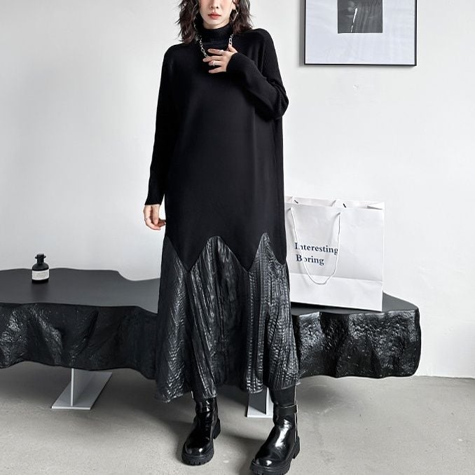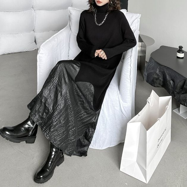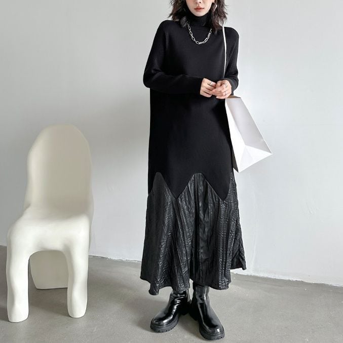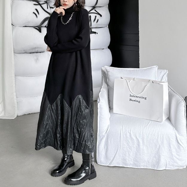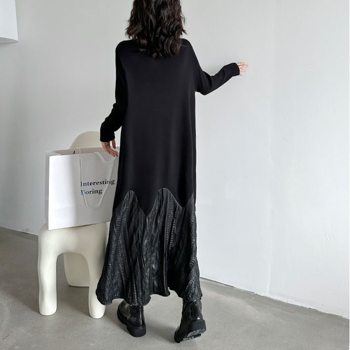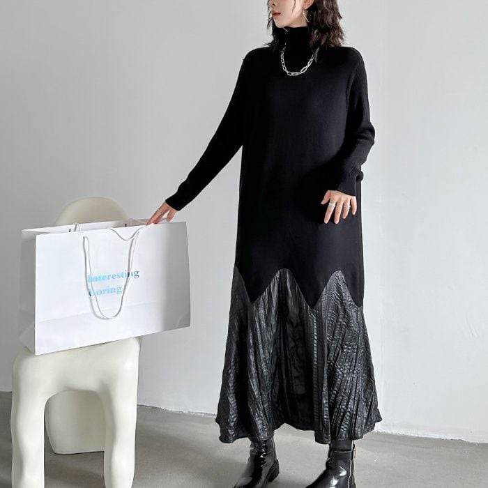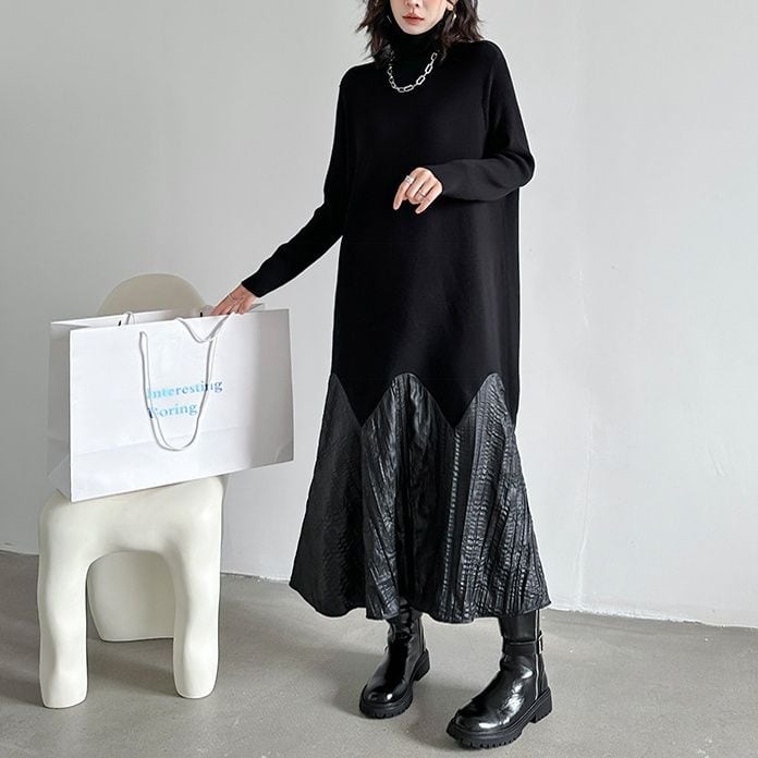 アニマルレザーのような裾のスティッチが特徴的な、ブラックのタートルネック・長袖・ロング丈・ニットワンピースです。ゆったりとしたマーメイドシルエットが美しい、エレガントでクールな印象のアイテムです。