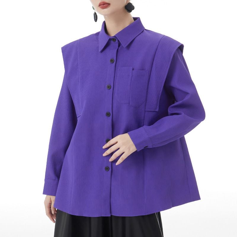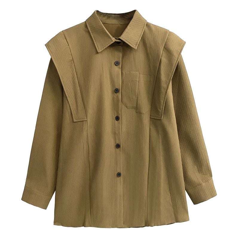 ショルダーにフラップ飾りの付いたシルエットが特徴的な、ポロ襟・長袖のコーデュロイシャツです。デザインポケットがお洒落な、単色でコーディネートしやすいカジュアルアイテムです。色は3色から選べます。