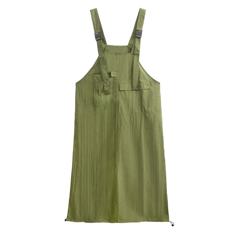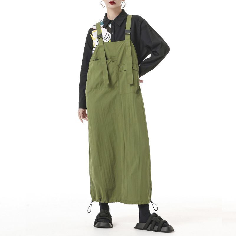 裾にドローコードが付いてシルエットをアレンジできる、ロング丈のストラップジャンパースカートです。バックル付きのストラップは長さを調節できます。デザインポケットやストレートラインがお洒落な、カジュアルアイテムです。ブラックとアーミーグリーンの2色から選べます。