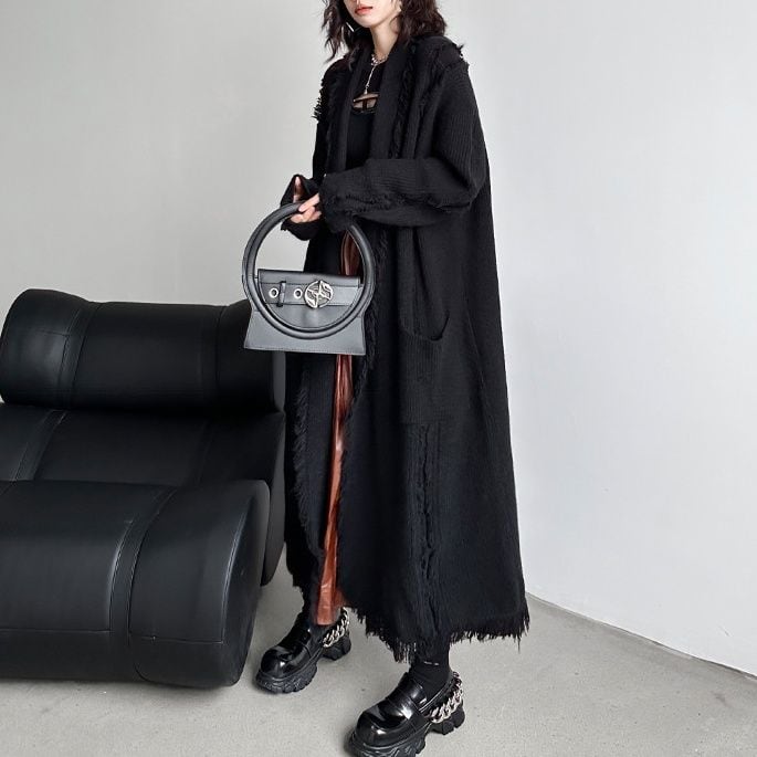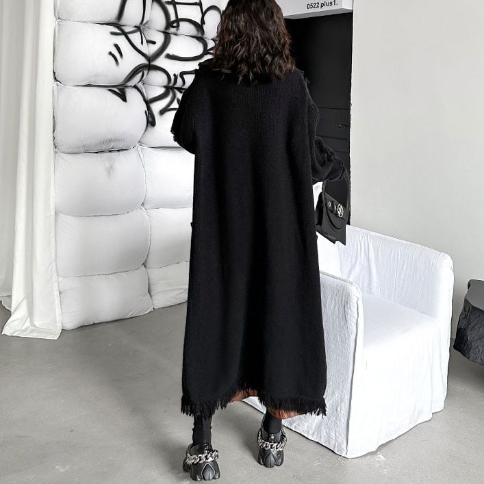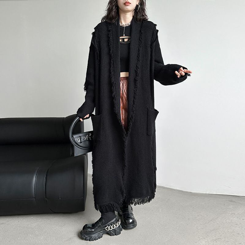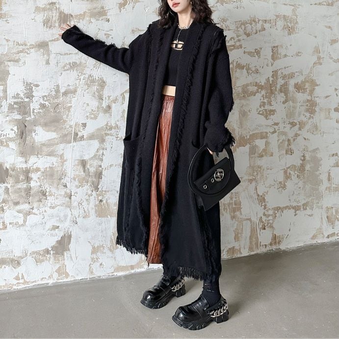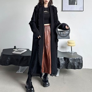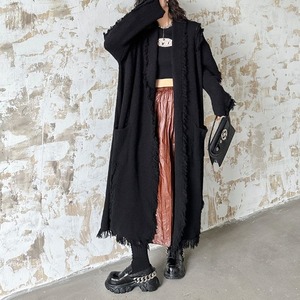 フリンジの縁取りやライン飾りがお洒落な、ブラックのロング丈・ニットカーディガンです。ゆったりとしたシルエットがエレガントな、何にでも合わせやすいカジュアルなアイテムです。