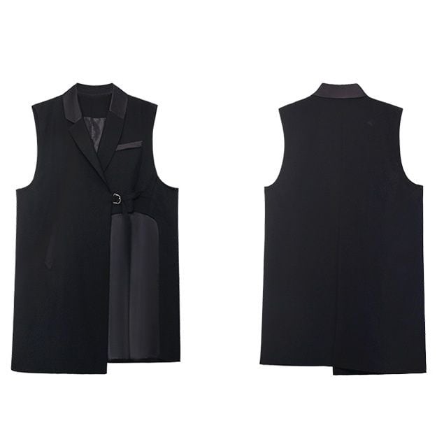 アシンメトリックなデザインが目を惹く、ブラックのラペル付きVネック・ミドル丈・ベストジャケットです。ダブルDリングでストラップを留めるデザインで、クールな印象のモード系アイテムです。